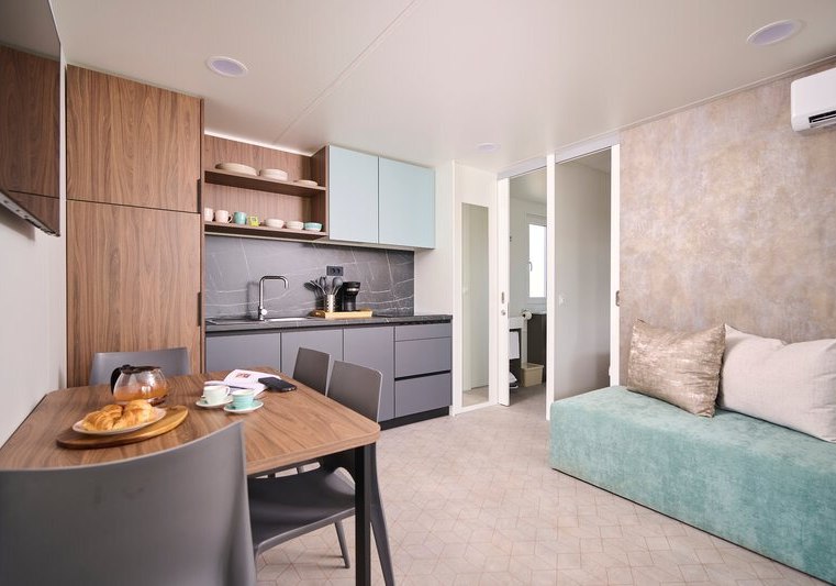 Je nach Kategorie erwarten Euch 24 bis 41 Quadratmeter, teils mit zweitem Badezimmer oder Schlafsofa. In ausgewählten Mobile Homes genießt Ihr einen privaten Pool. Badezimmer mit Dusche/WC, Haartrockner sowie Nichtraucher-Standard sorgen für klare, praktische Abläufe im Alltag.