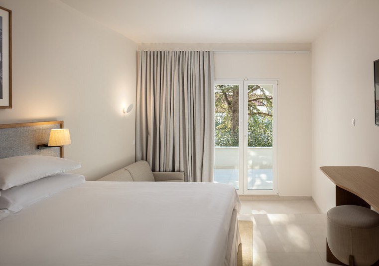 Ihr wohnt in klimatisierten Zimmern mit Balkon, Bad/WC, Föhn, Telefon, WLAN, Sat-TV, Safe und Minibar gegen Gebühr. Ausgewählte Kategorien bieten Meerblick. In Superior- und Familienzimmern ergänzt ein Schlafsofa die Schlafmöglichkeiten, Familienzimmer kombinieren Doppelbett und zwei Einzelbetten für klare Raumaufteilung.