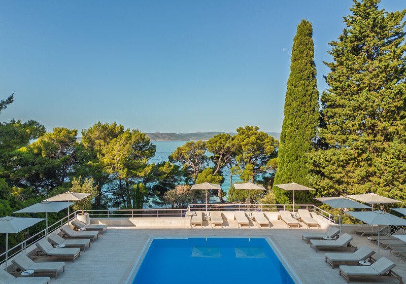 - Pool & Terrasse: Außenpool mit Sonnenterrasse, Liegen, Schirmen und Badetüchern.