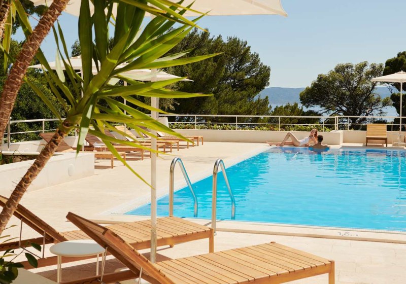 - Entspannt am Pool: Außenpool mit Liegen und Schirmen ergänzt den Strandtag.