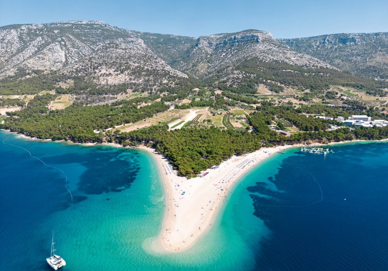 Die Adresse Put Zlatnog rata 50 führt Euch an die Südseite der Insel Brac, nach Bol in Kroatien. Prägend ist der direkte Bezug zum Strand Zlatni Rat: Ihr erreicht ihn über die Uferpromenade, die Anlage liegt also praktisch am Wahrzeichenstrand, ohne unmittelbaren Sandzugang durch das Grundstück. So wechselt Ihr nahtlos zwischen Meer, Pool und Sportflächen.