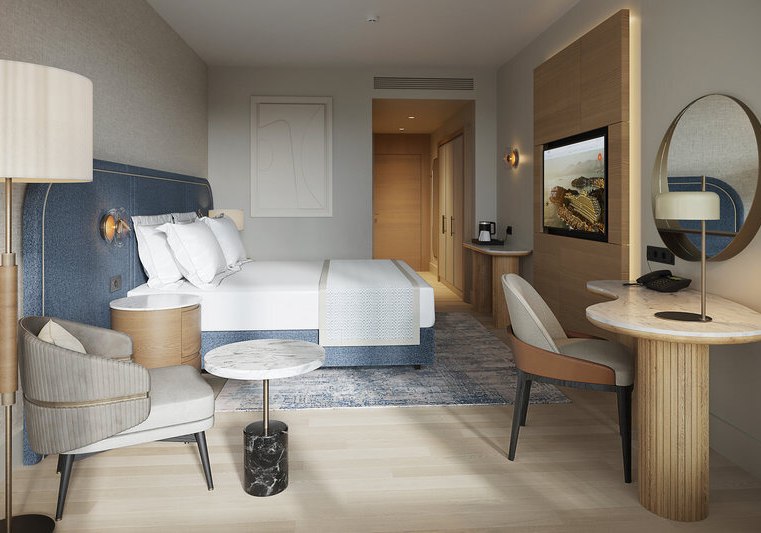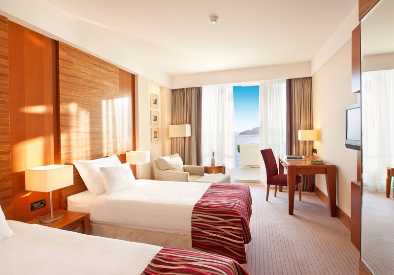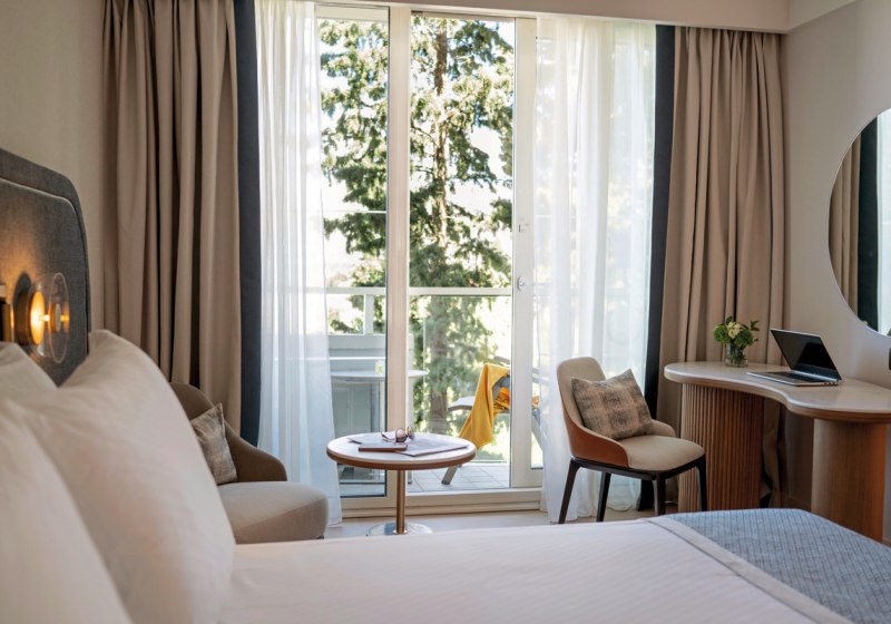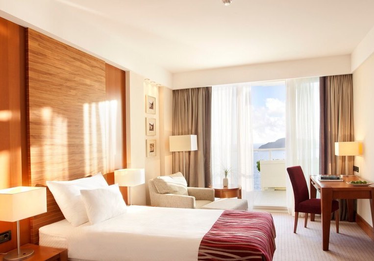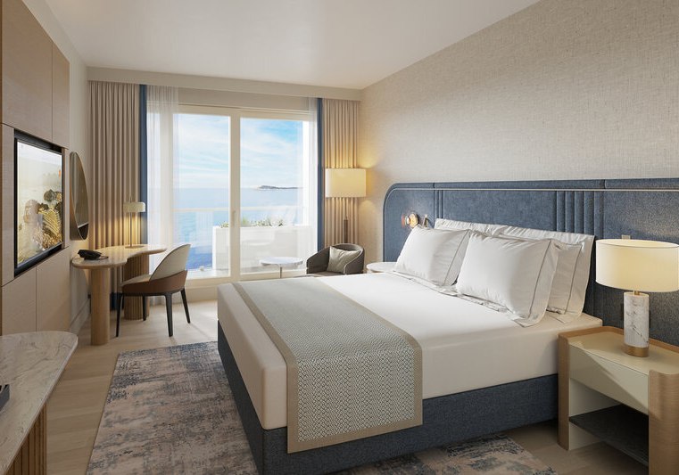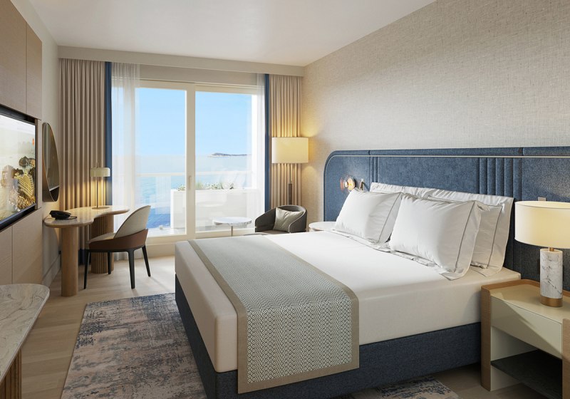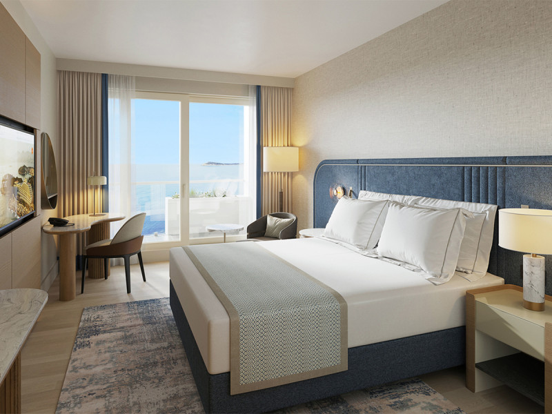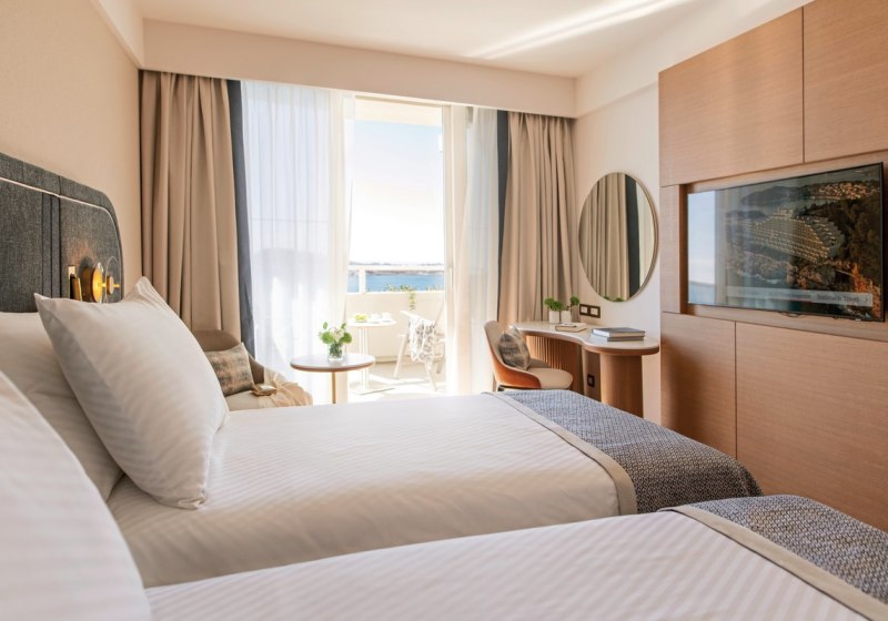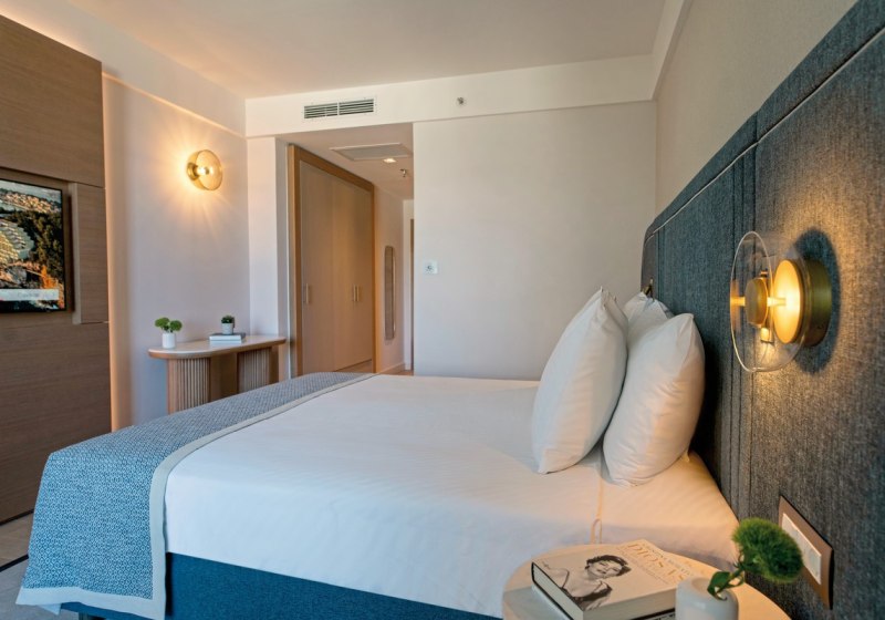 Im Hauptgebäude verteilen sich 487 Zimmer und Suiten über fünf Etagen mit Lifts. Die Ausstattung umfasst Bad/WC, Föhn, Flachbild‑TV, Safe, Bademantel und Slipper; die Minibar ist gebührenpflichtig. In den Meerblick‑Kategorien gehört ein Balkon dazu, ideal für klare Sichtachsen auf die Bucht.