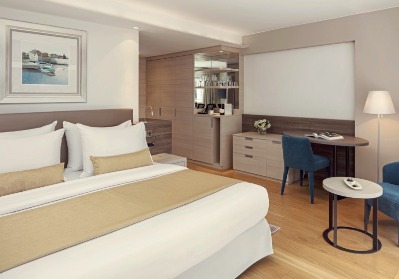 Die Zimmer zeigen klare Linien und praktische Details. Klimaanlage, kostenloses WLAN, Sat-TV, Telefon und Minibar gehören zur Grundausstattung. Badezimmer mit Badewanne oder Dusche, WC, Föhn und teils Vergrößerungsspiegel runden den Komfort ab. Ein Teil der Zimmer verfügt über Balkon; je nach Kategorie blickt Ihr zur Meerseite oder auf den Park.