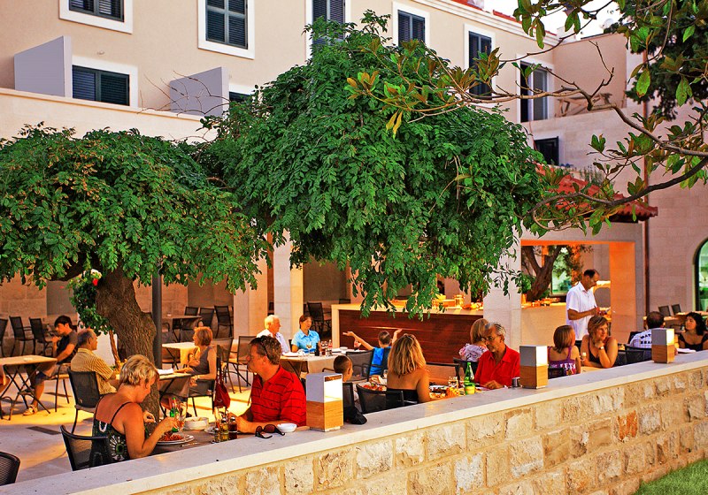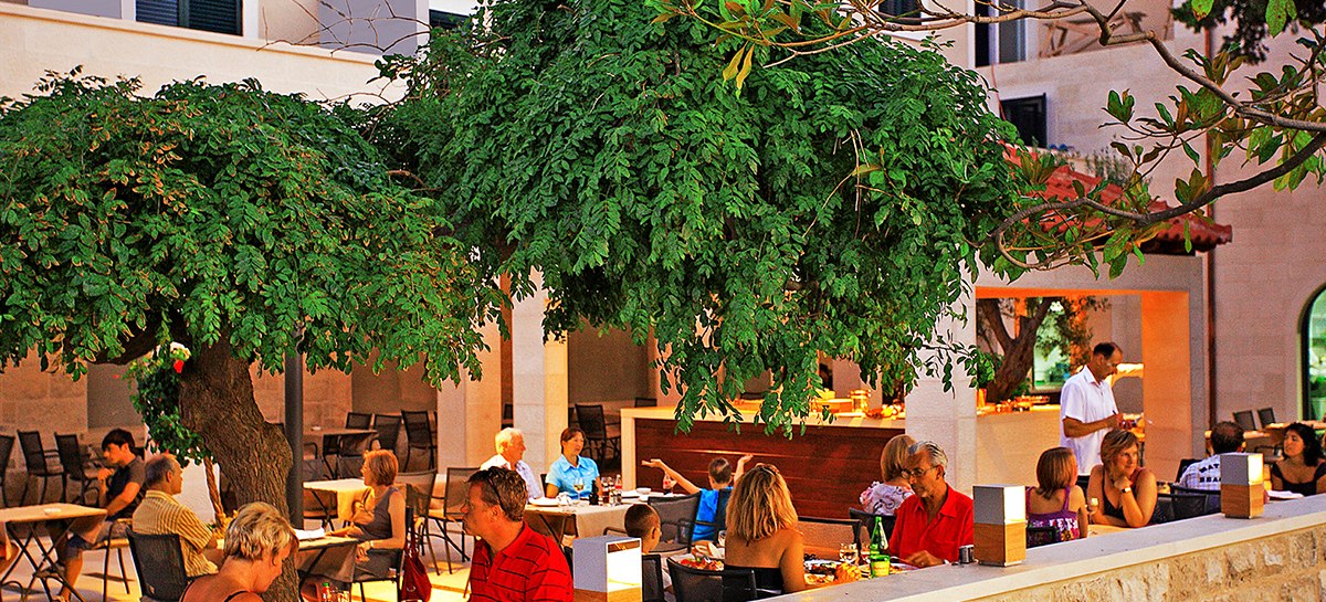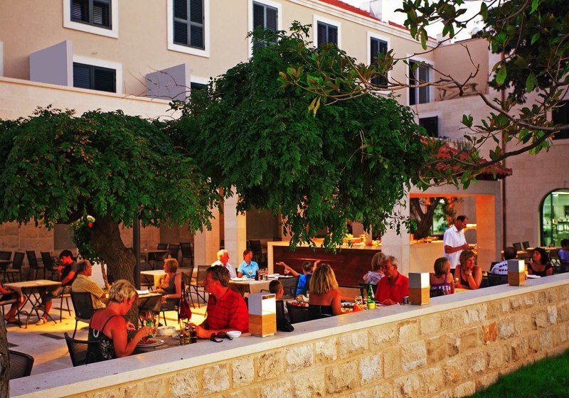 Ihr startet den Tag am Frühstücksbuffet und entscheidet später zwischen Restaurant und À-la-carte-Restaurant. Die Aperitifbar dient als lockerer Treff vor dem Gang durch Postira oder nach einem Sprung in den Pool. So bleibt Ihr kulinarisch flexibel und nah an Eurem Rhythmus.