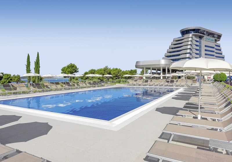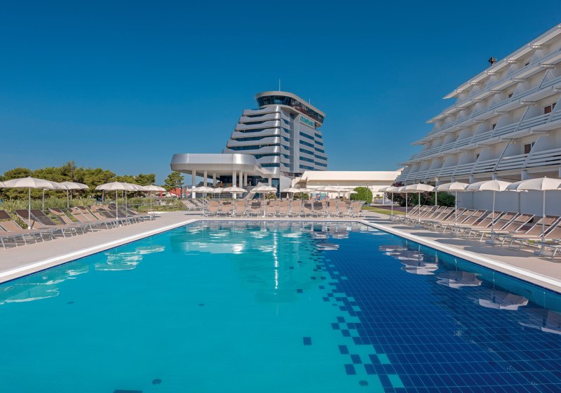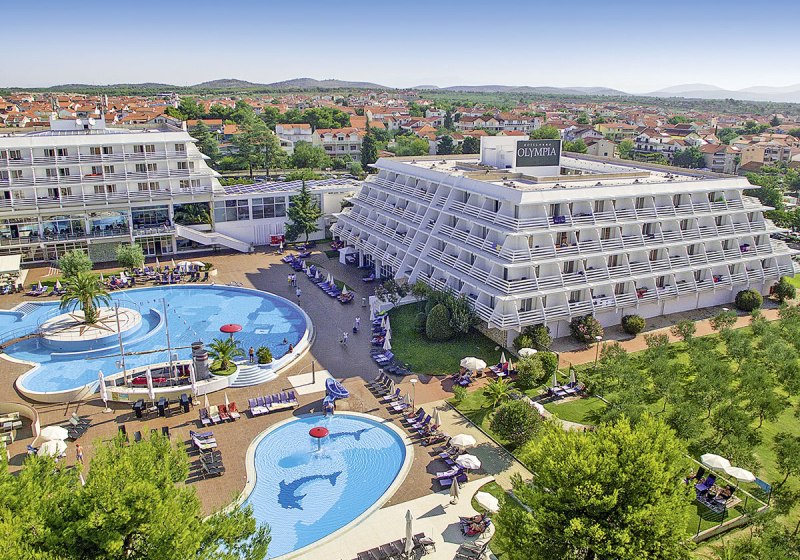 Im Hotel Olympia wohnt Ihr direkt am Kiesstrand von Vodice. Zwei Gebäudeflügel mit Lobby und 24‑h‑Rezeption bilden den Rahmen, dazwischen liegen Außenpool und Sonnenterrasse. Die Atmosphäre wirkt lebendig, ohne hektisch zu sein. Familien, Paare und Aktivreisende finden dank breiter Infrastruktur klare Strukturen für entspannte Tage.