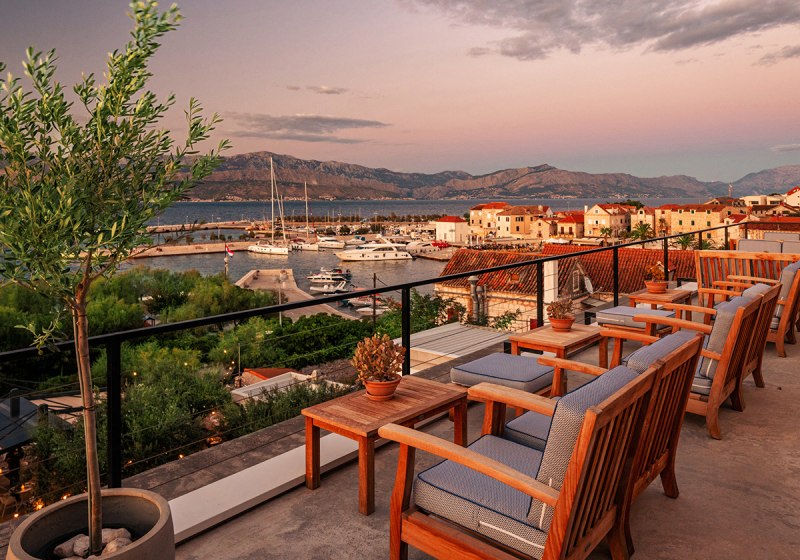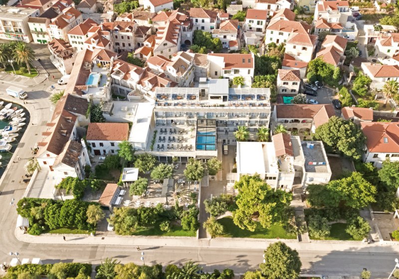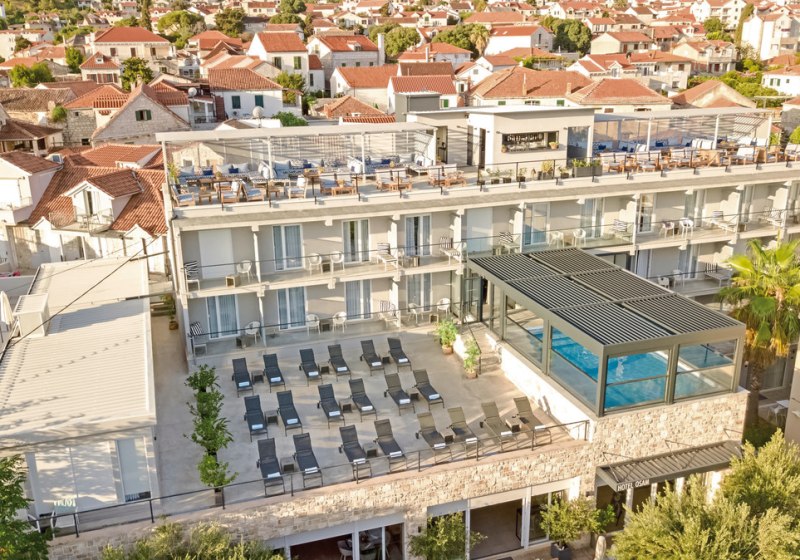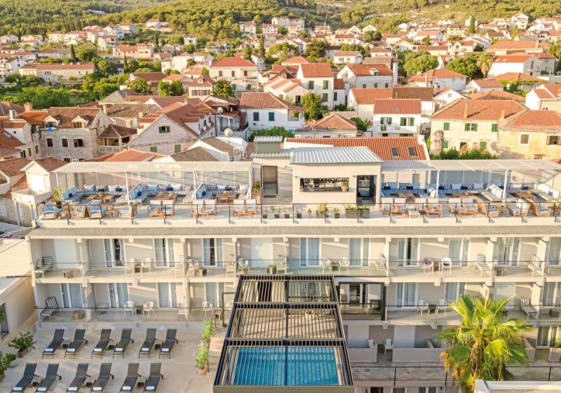 Im Hotel Osam – Adults only wohnt Ihr direkt am Hafen von Supetar – überschaubar, konzentriert und klar auf Erwachsene ausgerichtet. 28 Zimmer schaffen eine ruhige, persönliche Atmosphäre. Ihr gleitet vom Frühstück auf der Terrasse in den Tag, springt später in den Süßwasserpool oder schaut vom Dach hinüber aufs Meer.