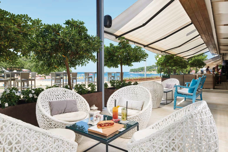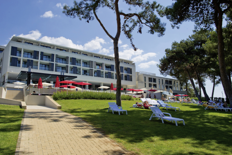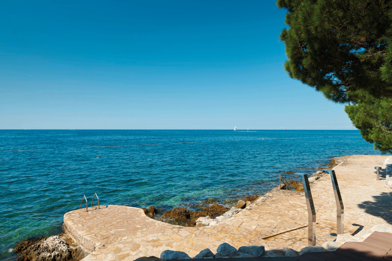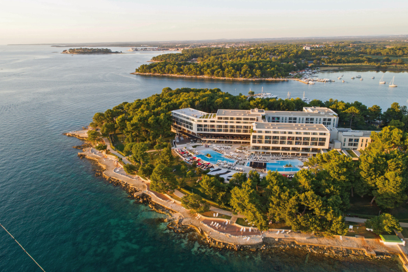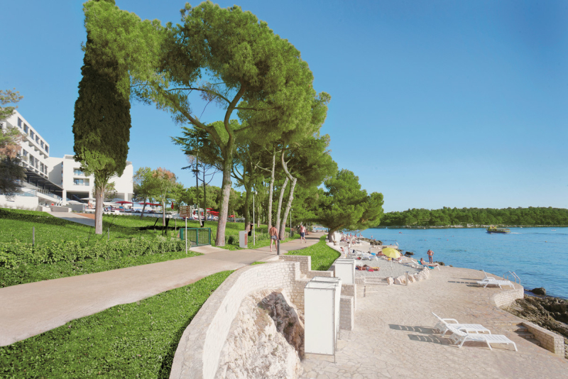 Das Hotel liegt auf einer Halbinsel, nur 50 Meter vom Felsstrand entfernt. Das Stadt-/Ortszentrum ist ca. 5 km entfernt und Einkaufsmöglichkeiten, Restaurants und Bars sowie die Bootsanlegestelle sind innerhalb von 10 Gehminuten erreichbar. Der Flughafen Pula ist ca. 60 km entfernt.