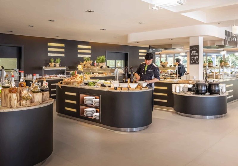 - Drei Anlaufpunkte: Hotelrestaurant, Pizzeria und Cafeteria decken unterschiedliche Essenssituationen ab.