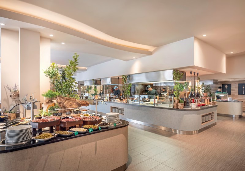 Im Hauptrestaurant kombiniert Ihr Buffets mit Show‑Cooking und sitzt auf Wunsch auf der Außenterrasse. Das Angebot deckt Frühstück, Mittag‑ und Abendessen ab; Halbpension ist verfügbar. Vegetarische und glutenfreie Optionen sind ausgewiesen, ebenso Kindermenüs. Die Bewertungen zum Essen liegen auf Hervorragend – ein verlässlicher Hinweis auf Qualität und Konstanz. Highlight: Show‑Cooking mit Terrasse verbindet frische Zubereitung und offene Atmosphäre.
