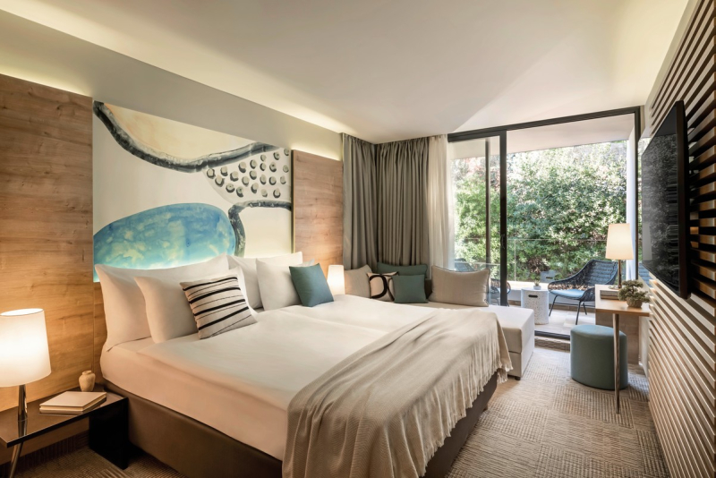 Die modern renovierten und ansprechend gestalteten Zimmer sind mit Flachbildfernsehern, WLAN, Safe und Minibar ausgestattet und verfügen über einen eigenen Balkon. Sie bieten Meerblick und verschiedene Belegungsoptionen, was sie sowohl für Paare als auch für Familien geeignet macht.
