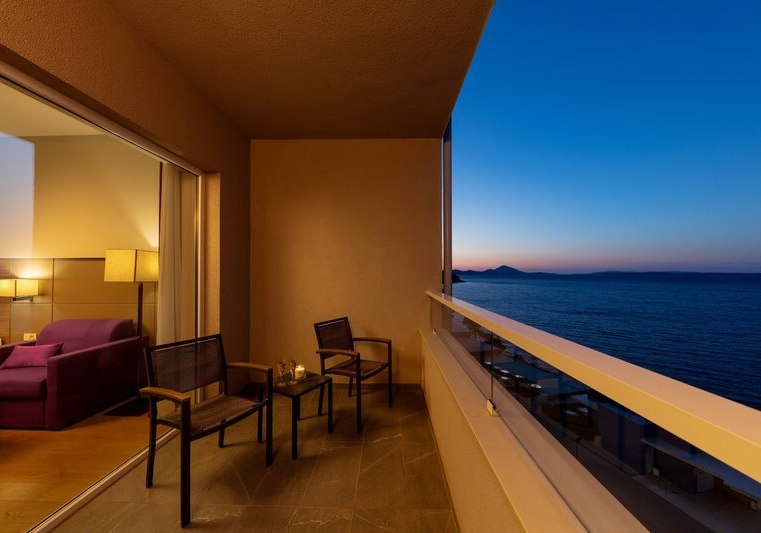 Das Wellnesszentrum bündelt Innen- und Außenpools mit beheiztem Meerwasser, Infinitybereich, Whirlpool sowie Hydro‑Massage‑Luftdüsen und Massage‑Wasserfall. Dazu kommen Bio‑Sauna, Finnische Sauna, Dampfbad, Hamam und vier Massageduschen. Der Outdoor‑Ruhebereich öffnet den Blick auf das Meer. Highlight: Meerwasser als roter Faden durch alle Poolzonen.
