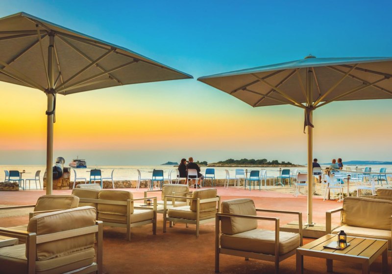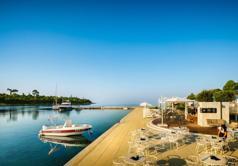 Maistra Select Island Hotel Istra kombiniert autofreie Inselruhe mit klarer Infrastruktur: zwei Außenpools, kurze Wege zum Sand- und Kiesstrand mit Duschen und eine stündliche Bootsanbindung nach Rovinj. Abends tragen Livemusik und Shows, tagsüber führen Sport und Wasser zu abwechslungsreichen Stunden.