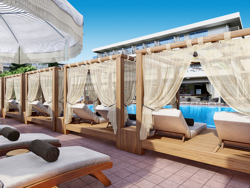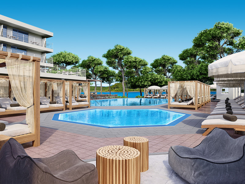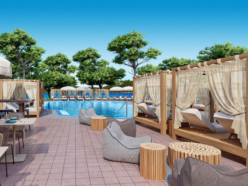 - Poolbereich: Aussenpool mit Sonnenliegen, Schirmen und Sonnenterrasse.