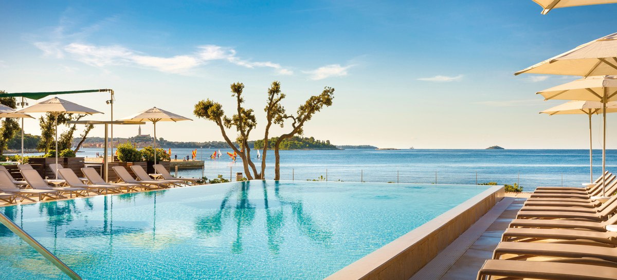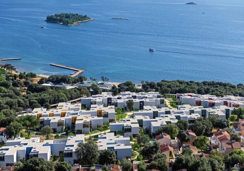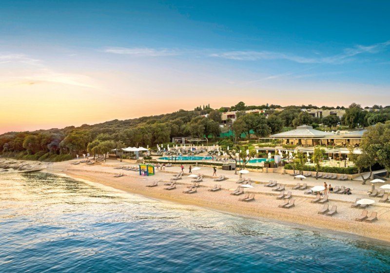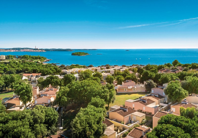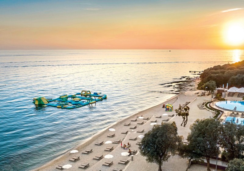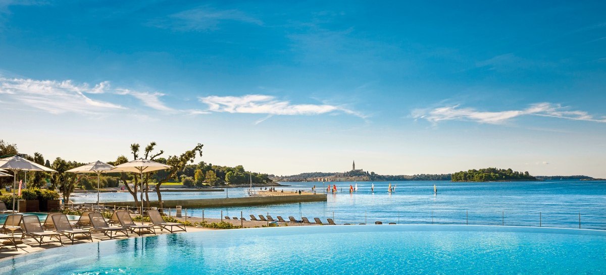 Das Resort liegt in Rovinj, Istrien, Kroatien – ruhig genug für klare Tage am Wasser und nah genug für Ausflüge in die Altstadt. Etwa 300 Meter trennen Euch vom Strand, rund 4 Kilometer vom Ortszentrum. Der Küstenabschnitt kombiniert 1.000 Meter Kiesstrand mit Felsen und Badeplateaus, was Euch unterschiedliche Einstiege ins Meer ermöglicht.