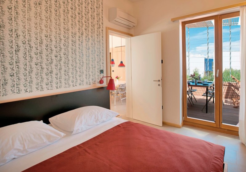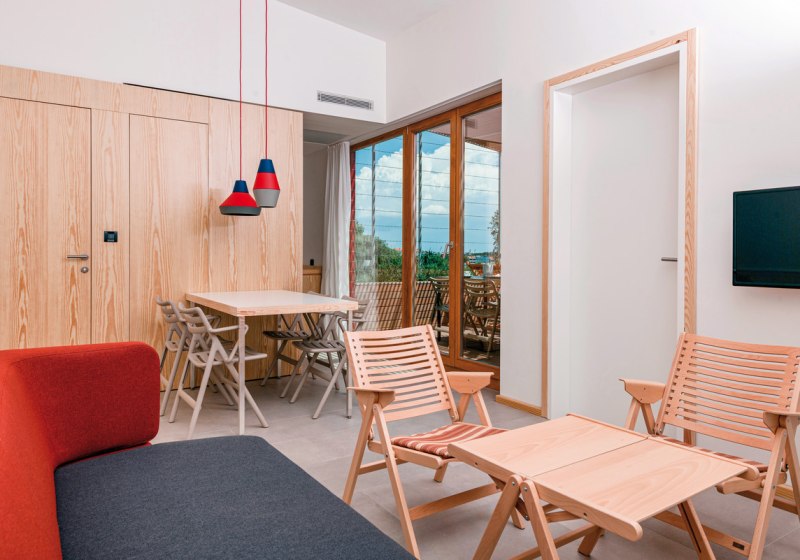 Ihr wohnt in Apartments mit ein oder zwei Schlafzimmern, teils über zwei Etagen. Separate Schlafräume und ein kombinierter Wohn-/Schlafbereich geben Euch klare Zonen. Die Kochnische ist mit Mikrowelle und Kaffeemaschine ausgestattet, teils ergänzt um Backofen oder Geschirrspüler. Ein Sofabett erweitert die Schlafmöglichkeiten, Balkon oder Terrasse führen nach draußen.