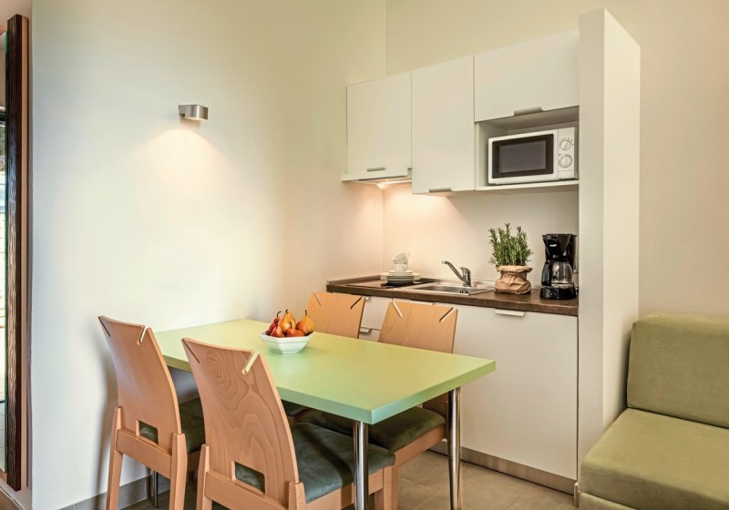 Ihr wohnt in Apartments mit ein oder zwei Schlafzimmern, je nach Typ ergänzt um einen Wohn-/Schlafbereich. Das schafft klare Rückzugsräume und Platz für gemeinsame Zeit. Die Kochnische mit Mikrowelle und Kaffeemaschine ermöglicht einfache Mahlzeiten, während Balkon oder Terrasse den Blick nach draußen öffnen. Klimaanlage, WLAN und Sat-TV sorgen für Komfort und Kontakt zur Welt.