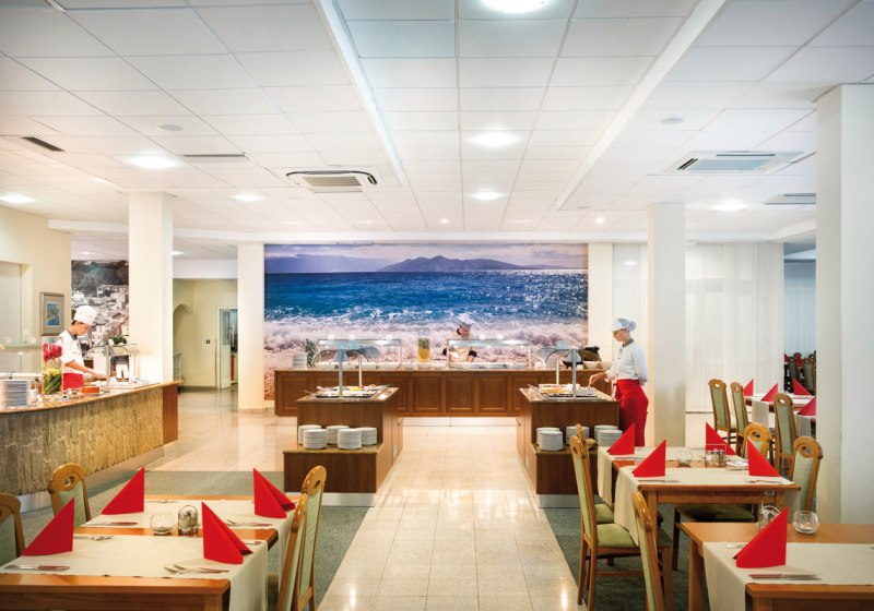 Im Restaurant wählt Ihr zwischen vielfältigen Verpflegungsoptionen – von Frühstück über Halb- oder Vollpension bis All-Inclusive. Vegetarische und Diätgerichte sind vorgesehen, sodass Ihr den Tag kulinarisch flexibel plant. Die Abläufe sind klar, die Wege kurz, der Service pragmatisch auf Strandrhythmus und Familienzeiten abgestimmt.