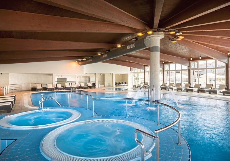 • Liegestühle • Hallenbad • Außenpool • Sonnenschirme • Pool • Poolbar • Sonnenterrasse • Wasserrutsche • Badetücher
