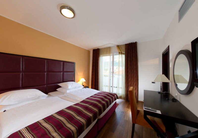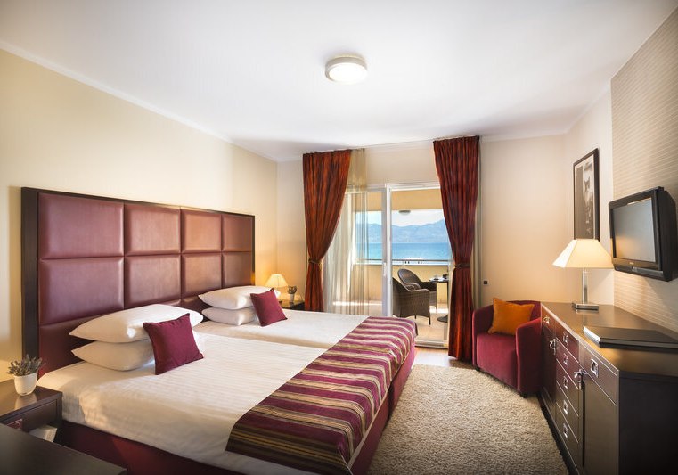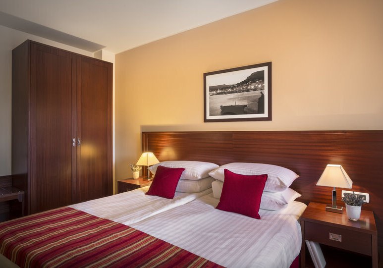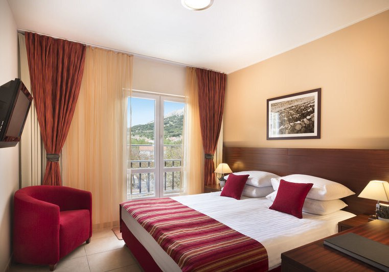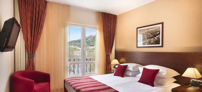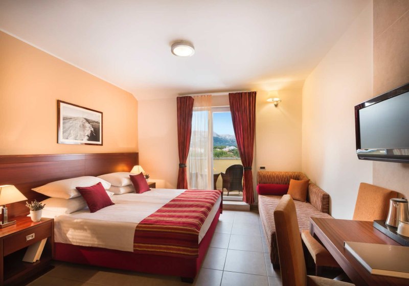 Nur etwa 100 Meter trennen Euch vom Kiesstrand Vela plaža – ein naheliegender Fixpunkt für alle, die das Meer täglich einbauen möchten. In den zwei Restaurants und an der Bar bleibt Ihr kulinarisch beweglich, von Frühstück bis Abendessen inklusive Optionen für Halbpension. WLAN ist kostenlos, Poolhandtücher liegen bereit, Check-in startet ab 15 Uhr, Check-out endet um 10 Uhr. Das Haus wirkt kompakt, übersichtlich und serviceorientiert – ideal für strukturierte, unkomplizierte Tage am Wasser.