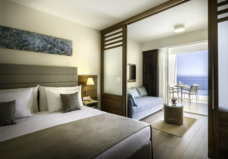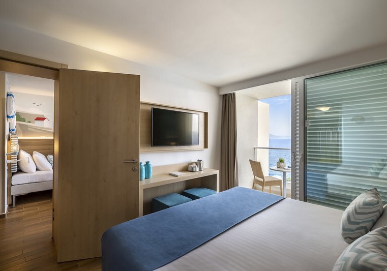 Für Familien sind die Optionen breit: Familienzimmer mit separatem Schlafbereich per Schiebetür oder Trennwand, Zimmer mit Verbindungstür und zwei Bädern sowie Suiten mit zwei Schlafzimmern und zwei Bädern. Swim‑up‑Zimmer bieten den Zugang zum Gemeinschaftspool direkt ab Terrasse. Ein ausziehbares Sofa ergänzt den Schlafkomfort, Kinderbetten sind verfügbar. So passt Ihr die Räume genau an Eure Aufenthaltspläne an. Highlight: Swim‑up Komfort – direkter Poolzugang aus ausgewählten Zimmern.