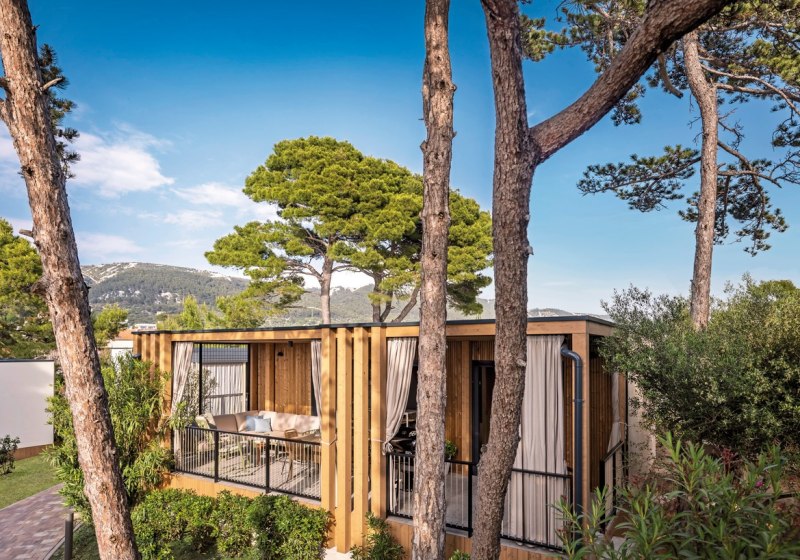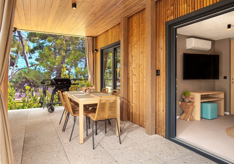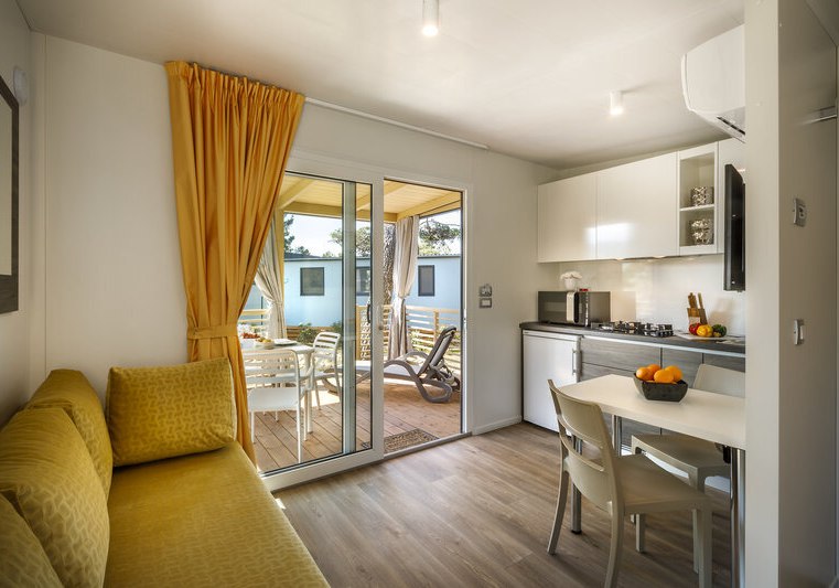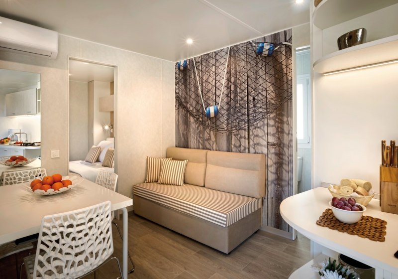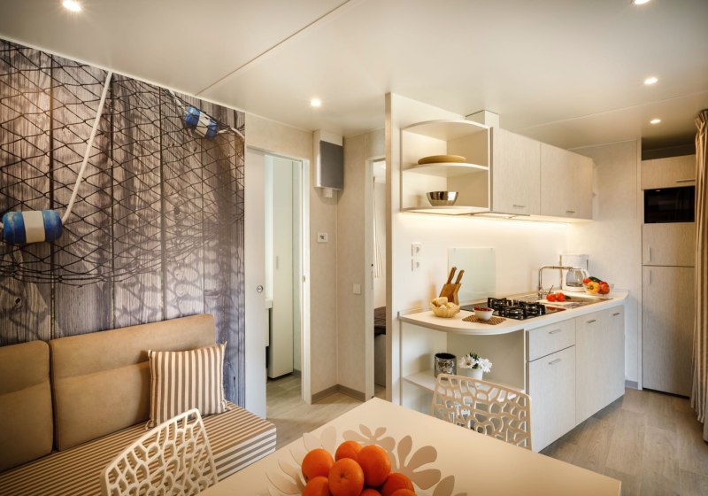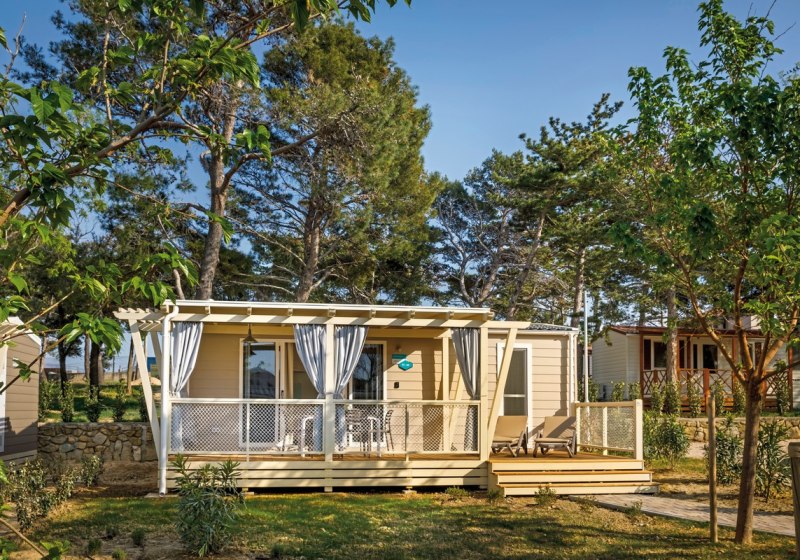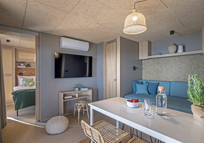 Besonders markant: Einige Mobile Homes bestehen zu einem hohen Anteil aus recyceltem Material, was Eurem Aufenthalt eine zeitgemässe Note verleiht. Rund um Rezeption, Shops, Minimarkt, Friseur und Bars spielt sich das entspannte Resortleben ab. Der Sandstrand liegt in der Umgebung; Ihr entscheidet, ob ihr lieber am Außenpool mit Sonnenterrasse bleibt oder zum Meer hinüber schlendert. Haustiere sind nicht erlaubt, die Atmosphäre bleibt entsprechend klar geregelt.