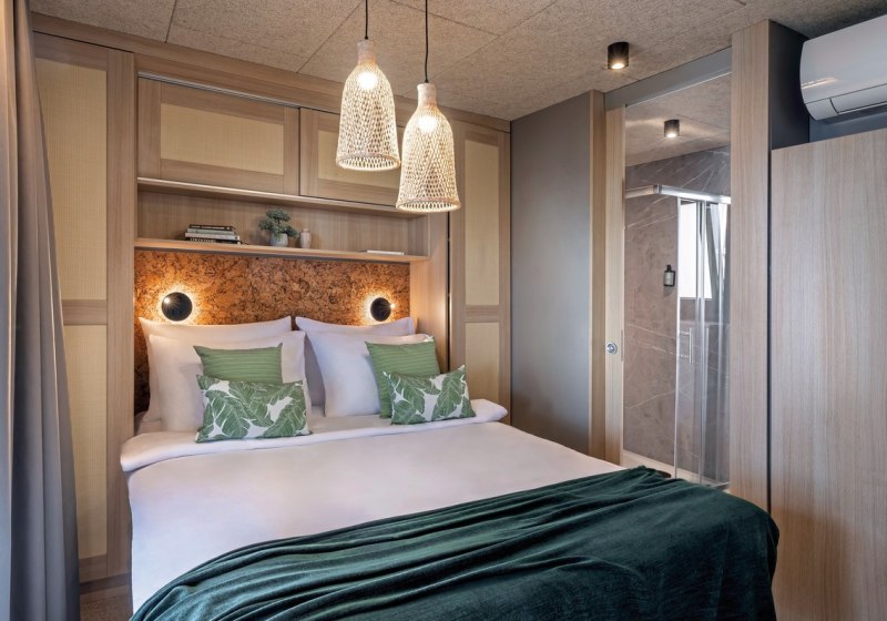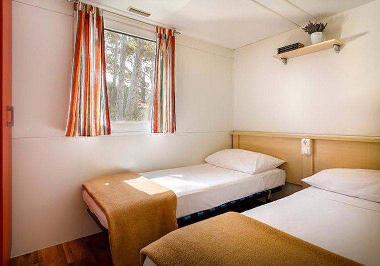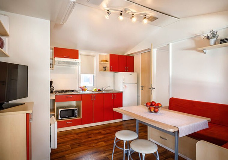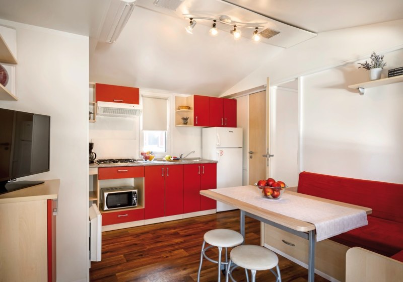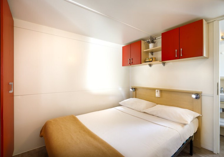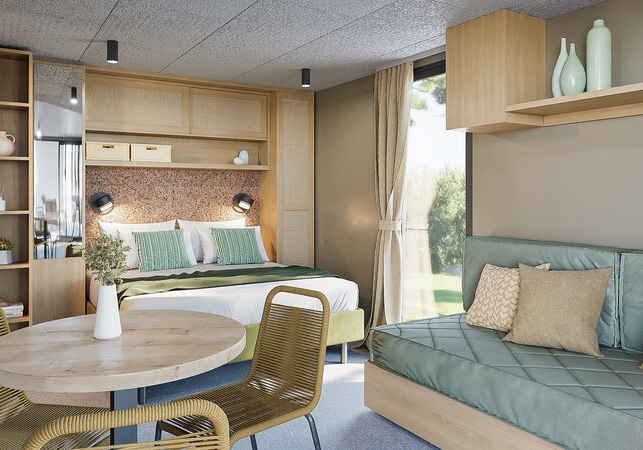 Ihr bezieht Mobile Homes oder Chalets mit durchdachter Aufteilung: 1–2 Schlafzimmer mit Doppel- oder Einzelbetten, dazu 1–2 Badezimmer mit Dusche und WC. Der Wohnbereich bietet ein Schlafsofa, ideal für Familien oder Freunde. Sat-TV und Klimaanlage sorgen für Komfort, WLAN ist inklusive.