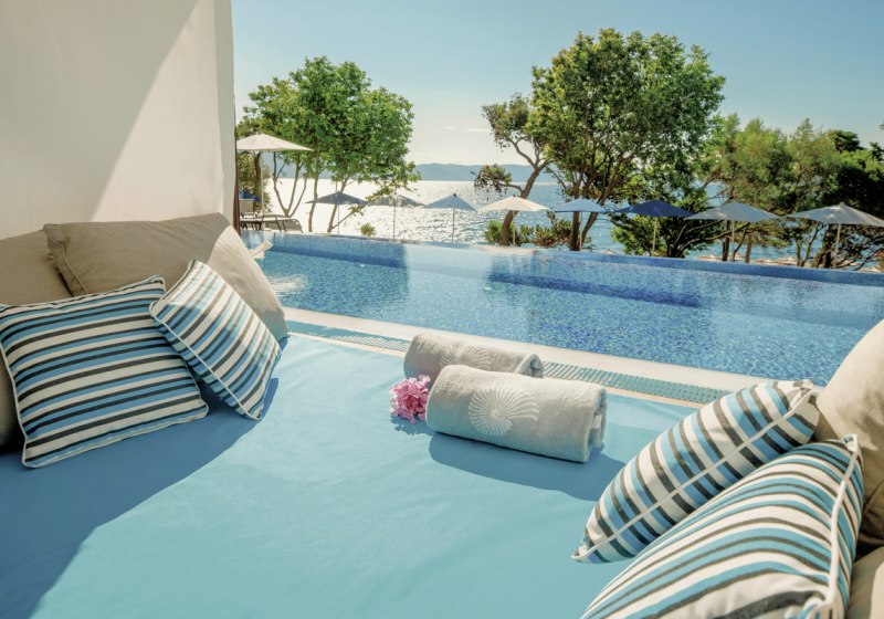 • Infinity-Pool: Außenpool mit Liegen und Schirmen als ruhiger Mittelpunkt.