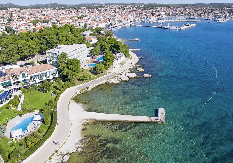 Die Adresse wirkt klar und bequem: Halbinsel Punta in Vodice, direkt an der Küste und etwa 150 Meter bis ins Zentrum. So erreicht Ihr Restaurants und Promenade zu Fuß, bleibt aber nah am Wasser. Das Wellness & Spa Center liegt rund 50 Meter entfernt. Die Lage vermittelt kurze Wege und eine ruhige, maritime Stimmung ohne städtische Hektik.