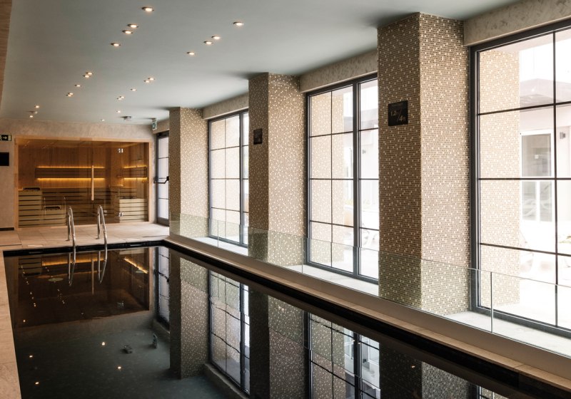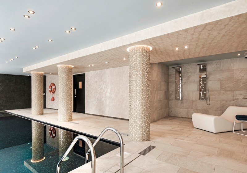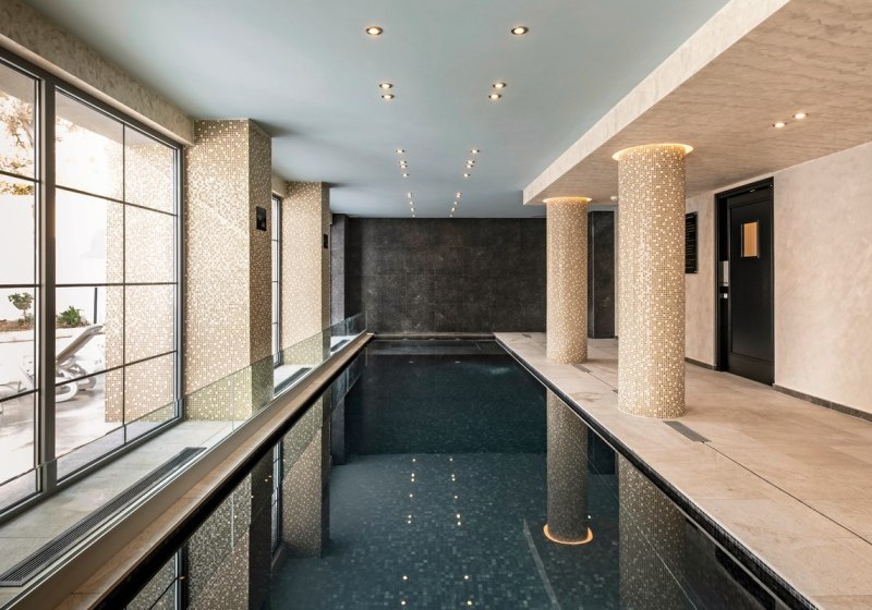 - Doppelte Wasserwelt: Innen- und Außenpool mit Sonnenterrasse und Poolliegen.