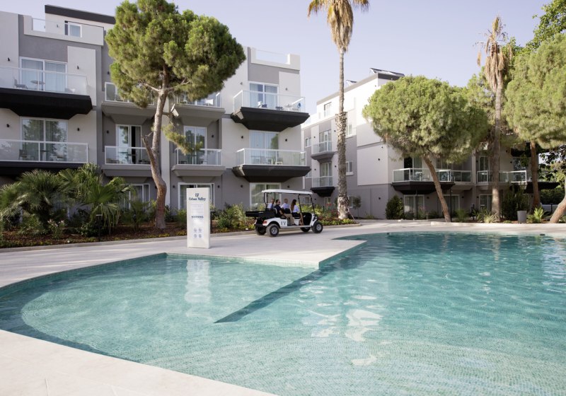 Im Urban Valley Resort & Spa richtet Ihr Euch in einem modernen Resort ein, das mit Haupthaus und sechs Nebengebäuden strukturiert ist. Der Blick fällt auf gepflegte Außenbereiche mit Pool und Sonnenterrasse, drinnen wartet eine Lobby mit Bar. Die Atmosphäre wirkt aufgeräumt und entspannt, getragen von klaren Linien und funktionaler Eleganz.