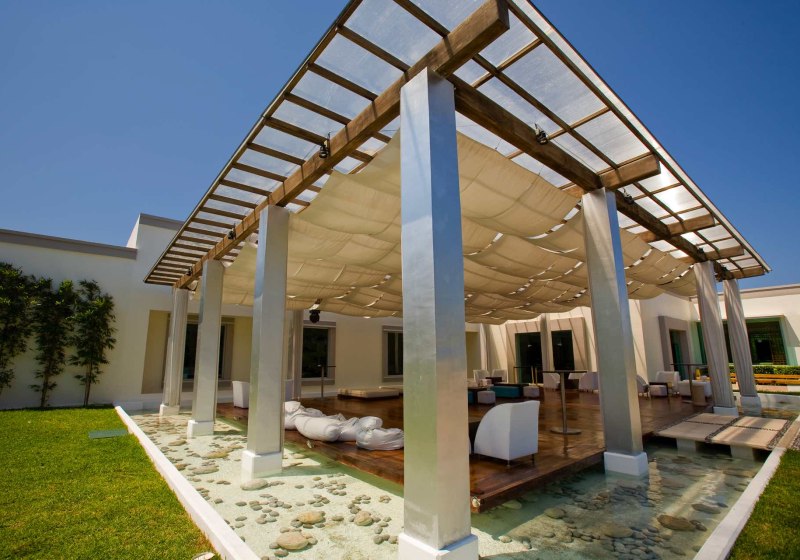 Die Anlage verteilt sich auf acht Gebäude mit Gärten, Wegen und großzügigen Wasserflächen. Mittelpunkt ist die Poollandschaft mit etwa 2.700 m², drei Pools und Kinderpool. Sonnenterrassen mit Liegen, Poolbar und Außenmöbel prägen die Freiflächen. WLAN ist im gesamten Hotel nutzbar, für ein Gerät pro Zimmer kostenlos.
