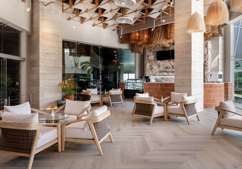 Die Anlage ist auf Komfort und Fluss ausgelegt: 24-Stunden-Rezeption, Aufzüge und WLAN in der gesamten Anlage, dazu Lobby, Terrassen und eine weitläufige Sonnenterrasse mit balinesischen Betten. Mehrere Pools strukturieren den Tag, darunter ein Infinity-Pool exklusiv für Erwachsene, flankiert von Liegen und Sonnenschirmen.