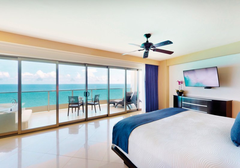 Ihr wohnt in Suiten mit 51–60 Quadratmetern und kombiniertem Wohn‑/Schlafraum. Ein möblierter Balkon öffnet den Raum nach draußen, teilweise mit Meerblick. Die Ausstattung umfasst Dusche, Haartrockner, Klimaanlage, Safe, Flachbild-TV und eine Minibar mit täglicher Auffüllung von Softdrinks, Bier und Wasser.