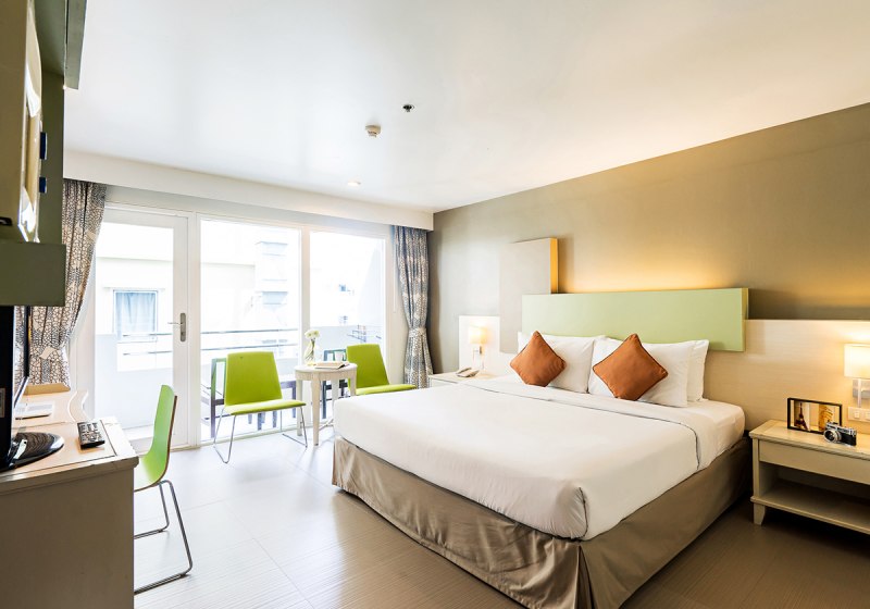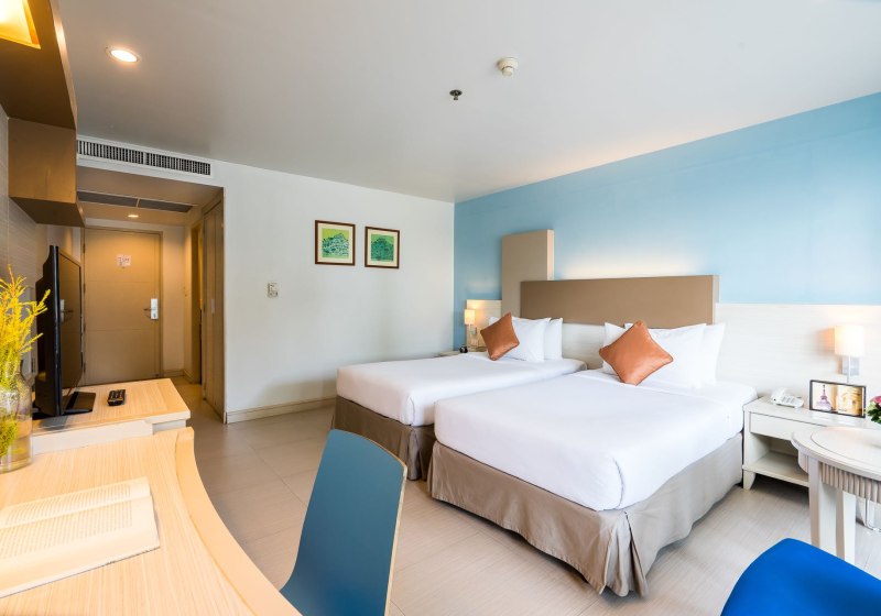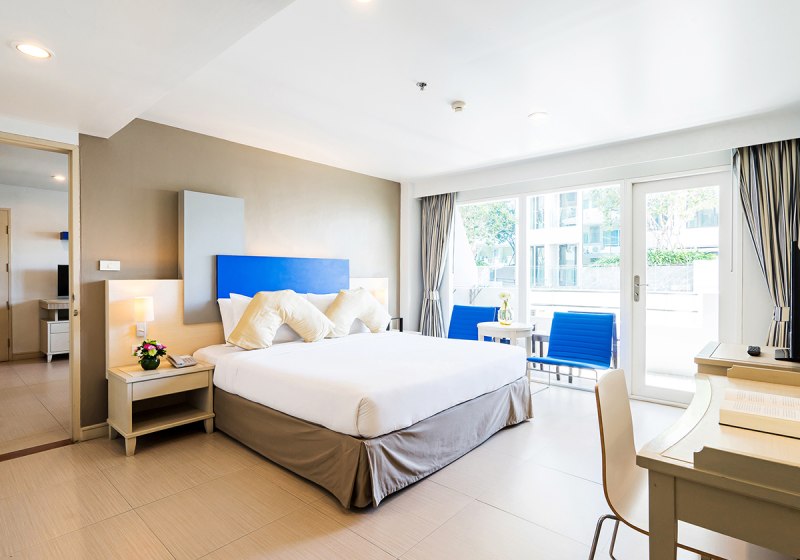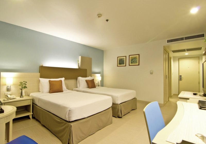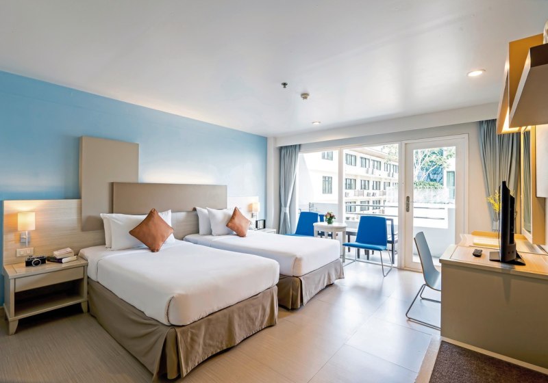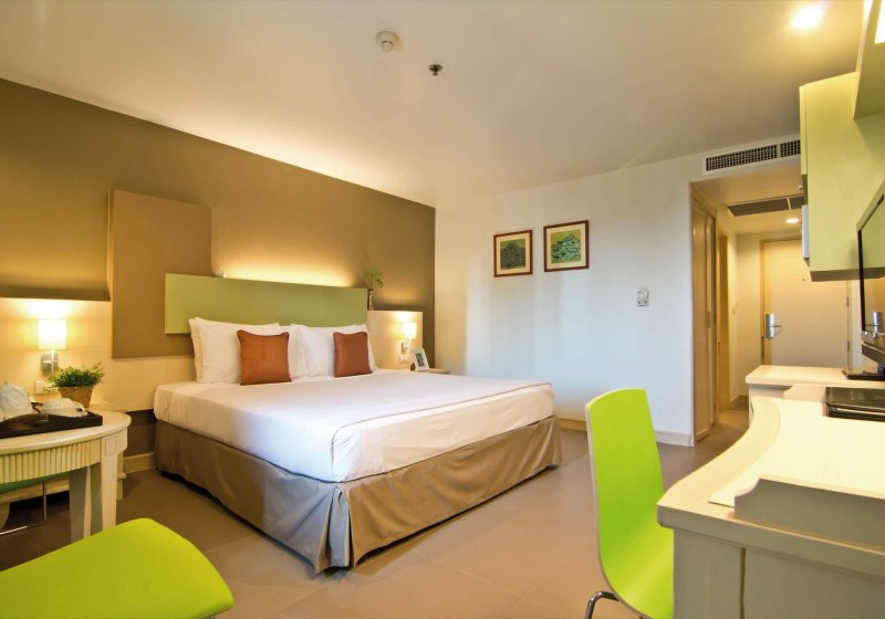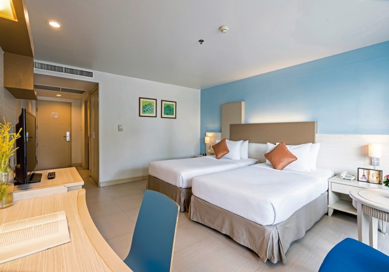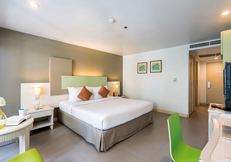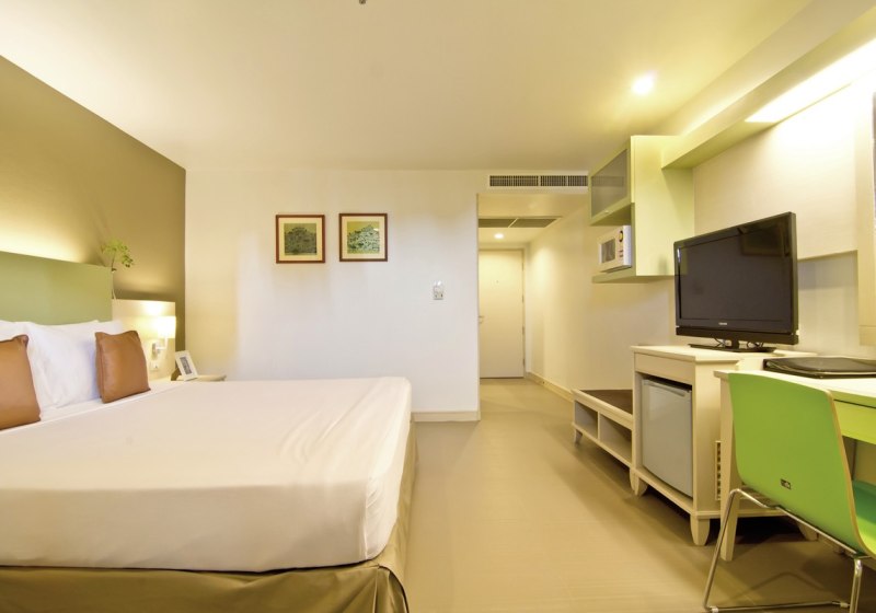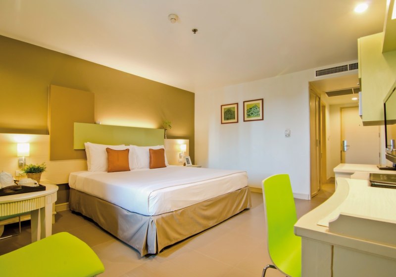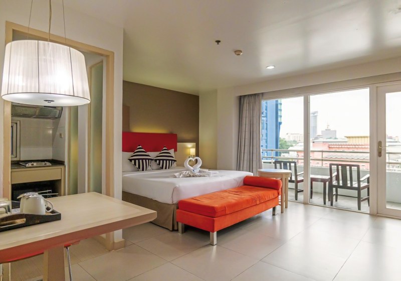 Studios mit Küchenzeile und Essbereich ergänzen Superior- und Deluxe-Zimmer mit praktischen Details wie Balkon, Klimaanlage und Sat-TV. WLAN nutzt Ihr in der gesamten Anlage kostenfrei. Für Entspannung sorgt das Spa, kulinarisch erwarten Euch ein À-la-carte-Restaurant mit thailändischer und internationaler Küche sowie eine Bar.
