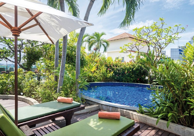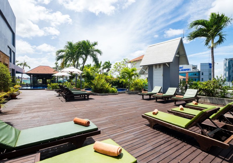 Oben über Pattaya: Der Dachpool ist Euer Ruhepol mit Sonnenterrasse, freien Liegen und Schirmen. Für zusätzliche Pflegeeinheiten steht das Spa bereit. Wer an Ausgleich denkt, nutzt den Fitnessraum und strukturiert so den Tag zwischen Strandgängen und Training.