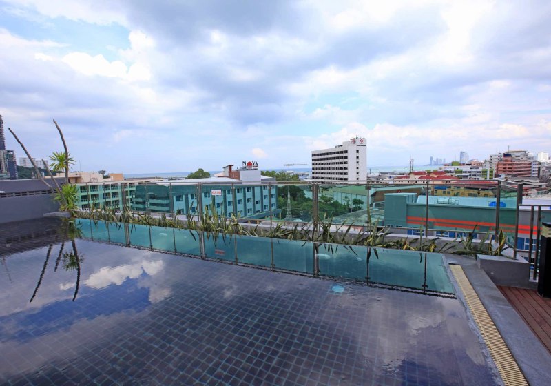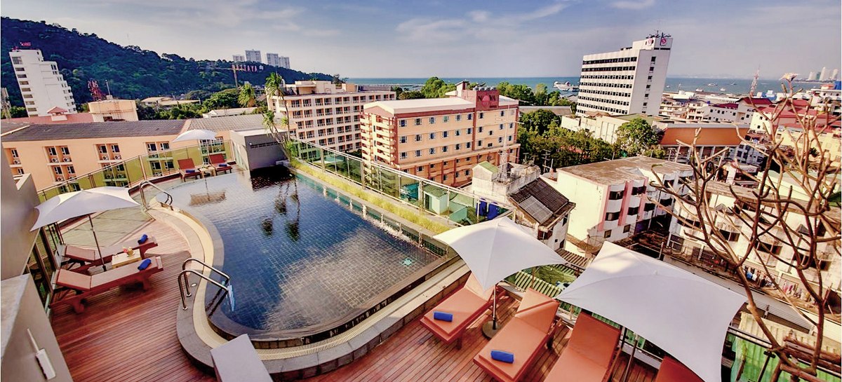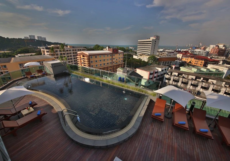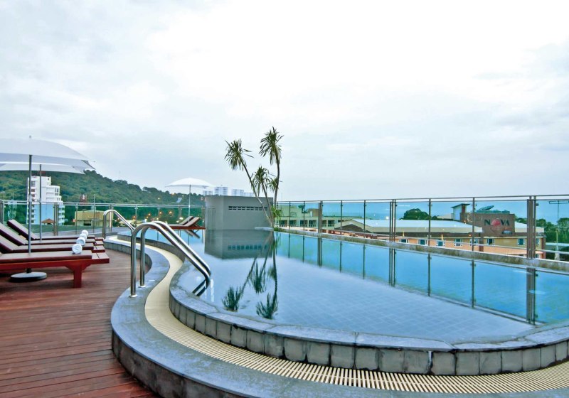 - Ruhiges Dachdeck: Rooftop-Pool schafft Rückzugsort über den Straßen von South Pattaya.