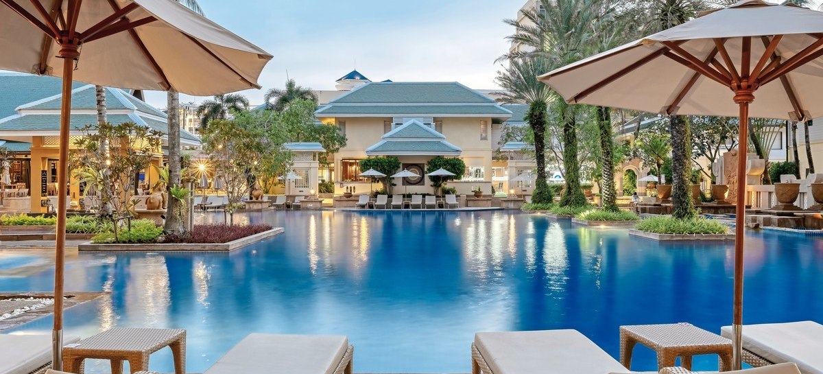 Zwei Außenpools mit Sonnenterrassen, Liegen und Schirmen treffen auf Gartenflächen und die Strandlage vis-à-vis. Praktische Services wie Wäsche- und Trockenreinigung, Arztbesuch im Hotel, SB-Wäscherei, Geschäfte, Supermarkt und Friseur sparen Wege. Barrierefreie Bereiche sind ausgewiesen; Aufzüge verbinden die Ebenen. Der Busakorn Pool ist ausschließlich Gästen des Busakorn Wing vorbehalten.