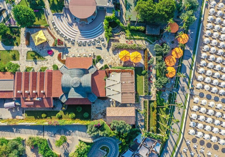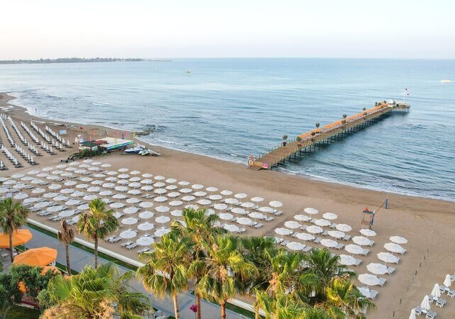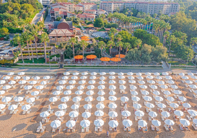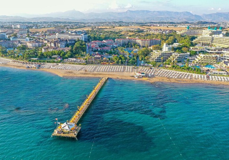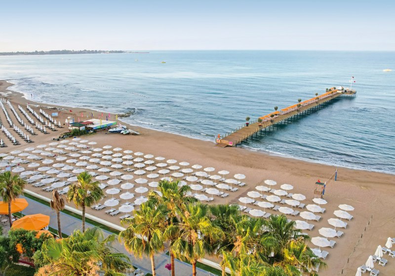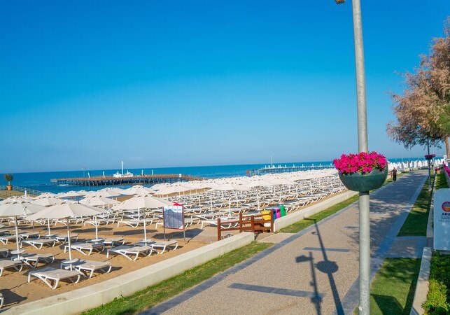 Ihr wohnt strandnah, nur die Promenade trennt Euch vom Sandstrand; ein Badesteg erleichtert den Weg ins Wasser. Bis Side sind es rund 3,5 Kilometer, das Stadtzentrum ist in etwa 3000 Metern erreichbar. Minibusse und Taxis verkehren in Hotelnähe, zum Meer sind es etwa 80 Meter. Felsen im Wasser machen Badeschuhe empfehlenswert. Zwei Strandbars, ein Beachclub und eine Erwachsenen-Strandzone strukturieren den Tag zwischen Meer und Rückzugsorten. Ein Krankenhaus liegt ungefähr 1000 Meter entfernt, was die Lage pragmatisch abrundet.
