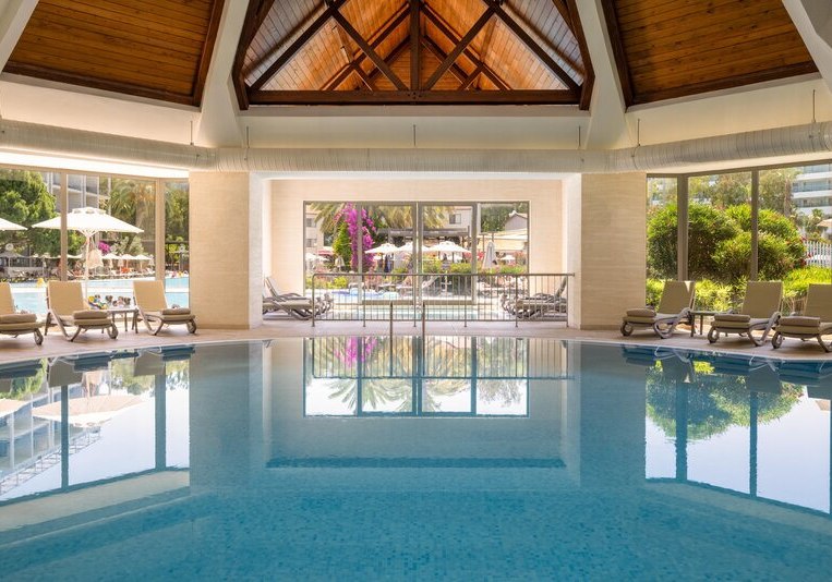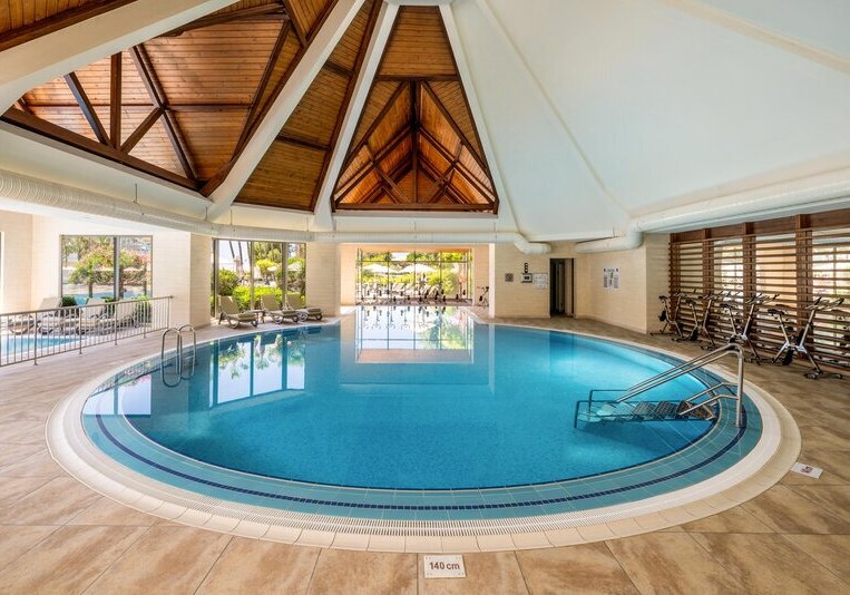 • Liegestühle • Hallenbad • Außenpool • Sonnenschirme • Poolbar • Sonnenterrasse • Badetücher • Wasserrutsche • Pool