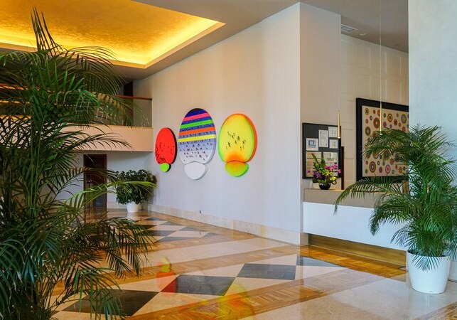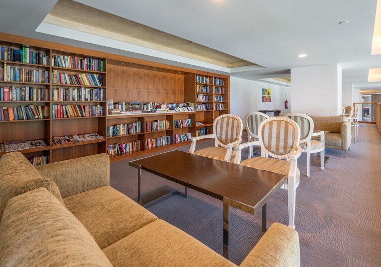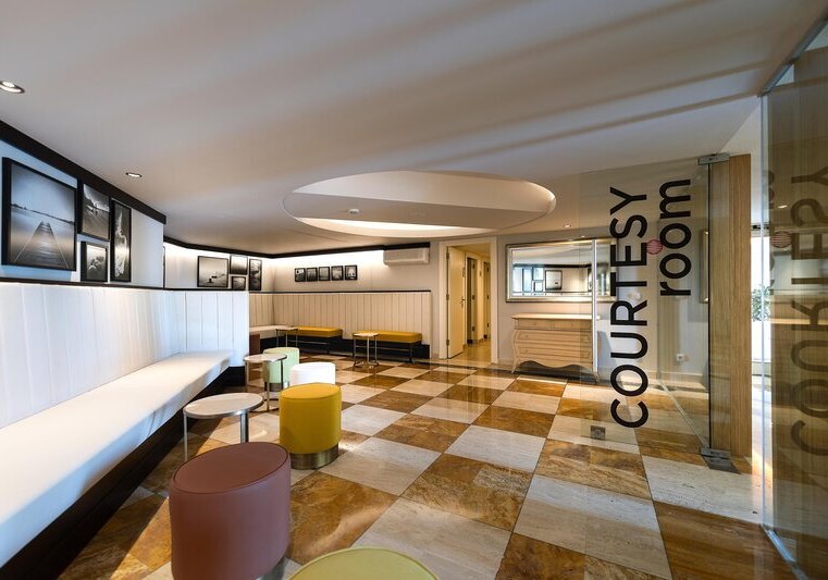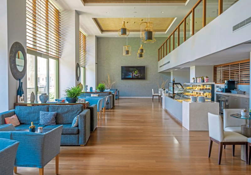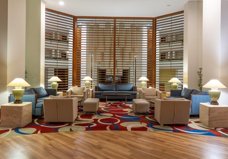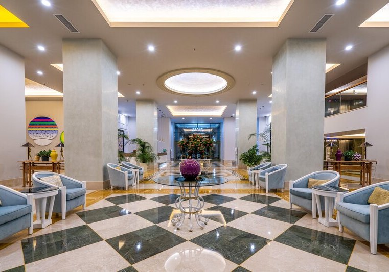 Das Hotelensemble kombiniert ein sechsstöckiges Haupthaus mit Lift und niedrigere Nebengebäude. Die öffentlichen Bereiche wirken geordnet: großzügige Empfangshalle, Lounge, Lobbybar und Terrassenflächen. WLAN ist im gesamten Hotel inklusive. Für Besorgungen stehen Geschäfte, Souvenir-Shop und ein Supermarkt bereit; ein Friseur ergänzt die Infrastruktur.