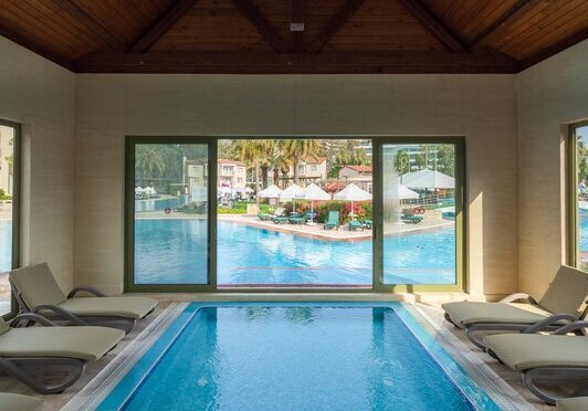 Zwischen Außen- und Hallenbad findet Ihr Raum für ruhige Bahnen. Das Spa- und Wellnesscenter bündelt einen klaren Fokus: Hamam, Sauna und Whirlpool stehen im Zentrum, ergänzt um Massage- und Beautyangebote. So wechselt Ihr nahtlos von Strandtagen zu erholsamen Innenmomenten.