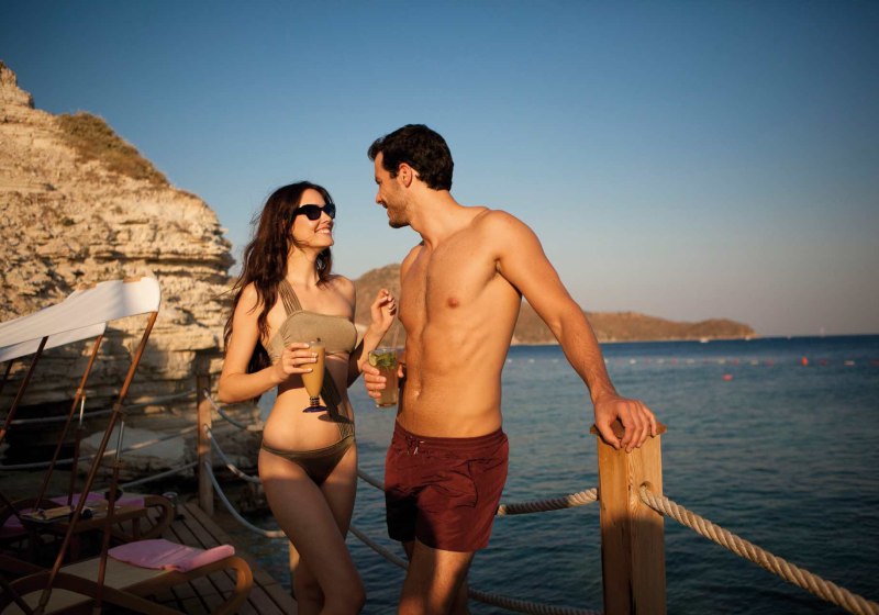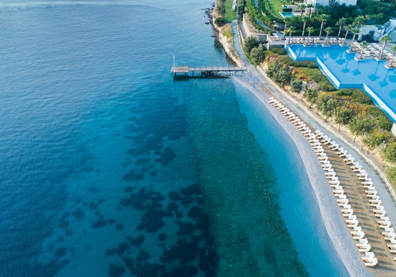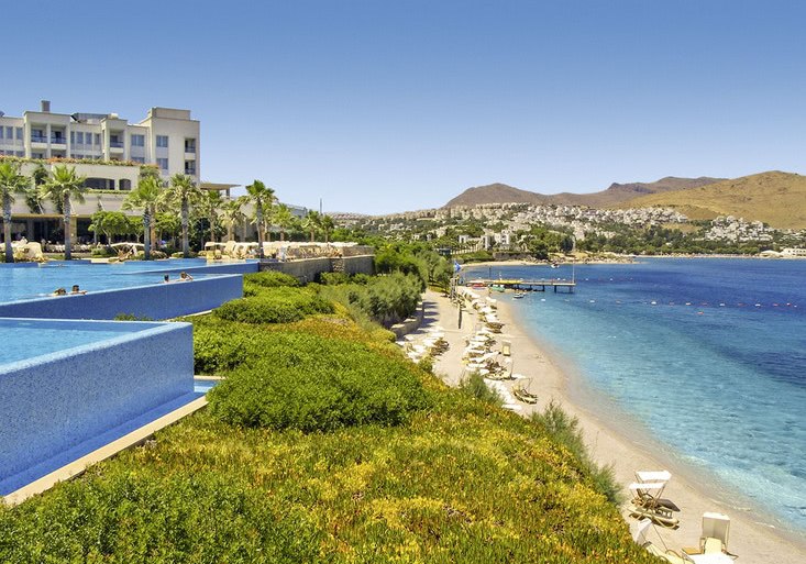 Ihr wohnt in Akyarlar, etwa 1 km vom Ortszentrum entfernt, mit direktem Zugang zu einem privaten Kiesstrand. Zwei Badeplattformen und Badestege erleichtern Euch den Einstieg ins Meer. Nach Turgutreis sind es rund 7 km, nach Bodrum etwa 25 km – eine gute Distanz für Tagesausflüge. Eine öffentliche Minibus-Haltestelle liegt direkt vor dem Hotel, sodass Ihr flexibel unterwegs seid. Auf dem Gelände findet Ihr Strand- und Poolbereiche mit Liegen und Badetüchern, dazu Sonnenterrassen für ruhige Stunden. Die Lage kombiniert Badekomfort vor der Tür mit erreichbaren Zielen in der Umgebung. Highlight: Öffentliche Minibus-Haltestelle am Hoteleingang ermöglicht unkomplizierte Wege zu Orten und Märkten.