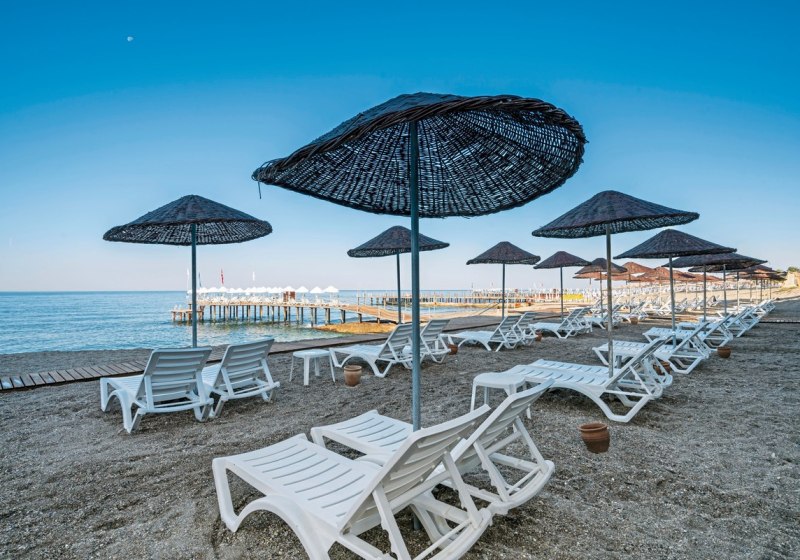 Ihr wohnt direkt am steil abfallenden Sand‑/Kiesstrand von Konakli – ein seltener Vorteil für alle, die den Tag gern zwischen Meer und Garten verbringen. Der hoteleigene Badesteg erleichtert den Zugang ins Wasser. In Hotelnähe bestehen Taxi‑ und öffentliche Busverbindungen, sodass Ihr flexibel zwischen Strandzeit und Ausflügen wechseln könnt.
