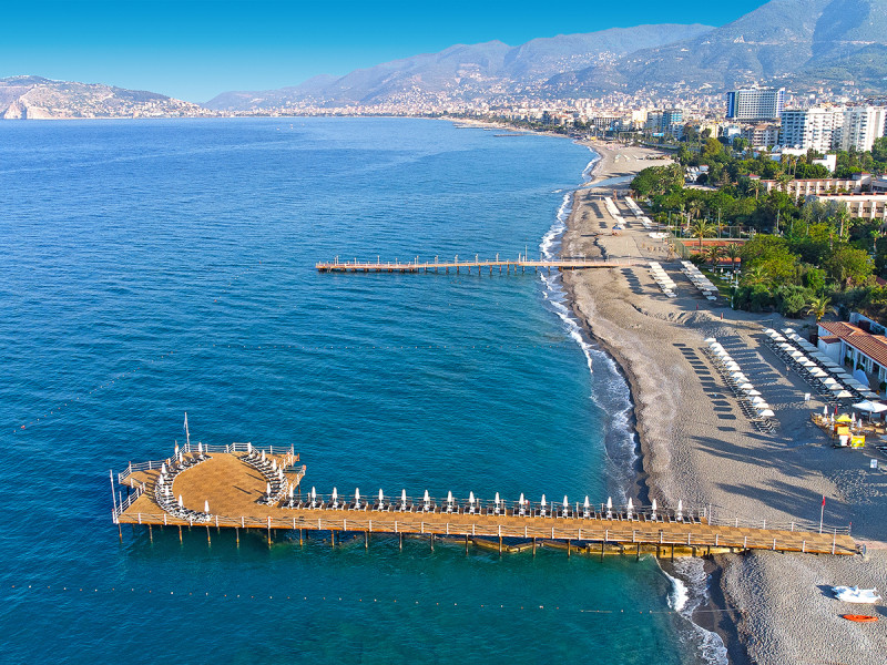 Die Lage auf einer Anhöhe über der Bucht von Alanya prägt Euren Aufenthalt: Mit Weitblick startet Ihr den Tag am Pool oder nehmt den hoteleigenen Shuttle zum hauseigenen Sand-/Kiesstrand mit Pier, rund 900 Meter entfernt. Dort erwartet Euch ein durchdachter Strandbereich mit Liegen, Auflagen und Sonnenschirmen, ergänzt von einer Beach-Snackbar. Zum lebhaften Zentrum von Alanya sind es etwa 7 Kilometer – nah genug für Ausflüge, weit genug für einen strukturierten Resorttag. Für Eure Anreise liegt der Flughafen Gazipasa (GZP) bei etwa 38 Kilometern Entfernung. Die Kombination aus erhöhter Lage, Strandzugang per Shuttle und urbaner Nähe schafft ein Setting, das Bewegung, Badepausen und Abstecher in die Stadt sinnvoll verbindet, ohne auf dem Gelände Kompromisse einzugehen.