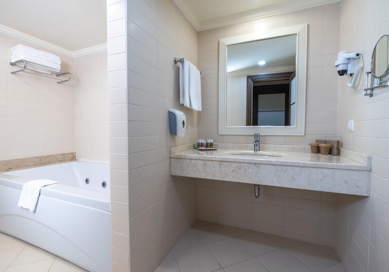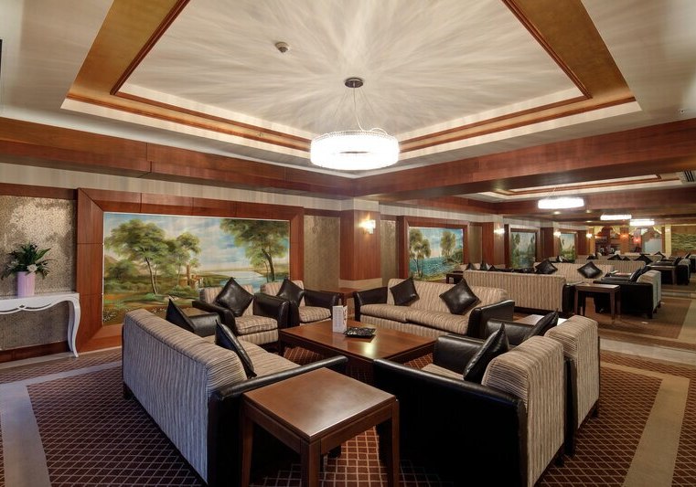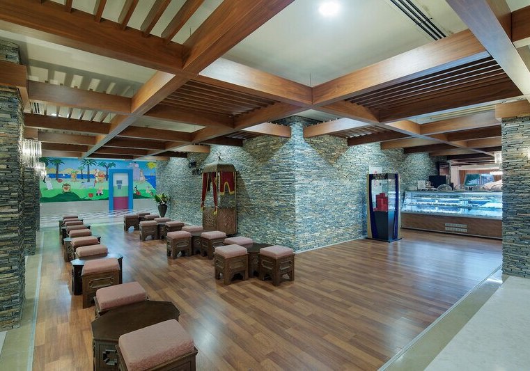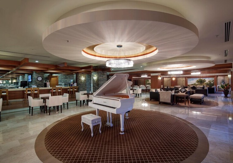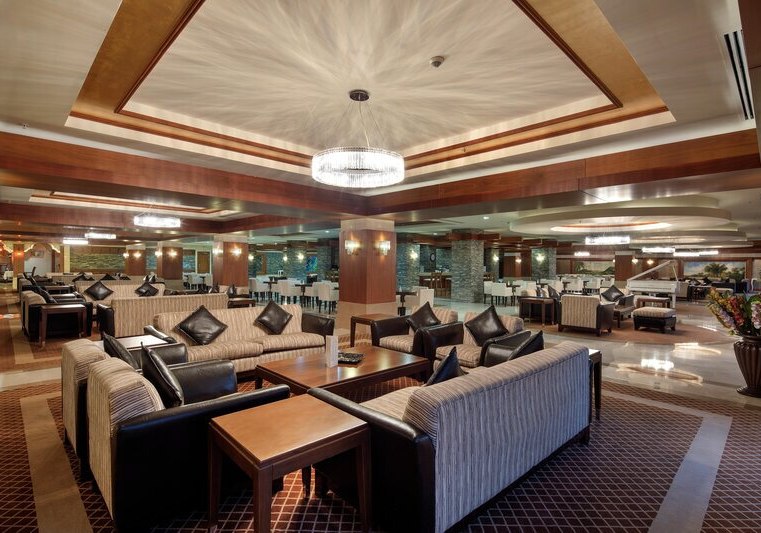 Die Anlage ist groß, aber übersichtlich: Empfangshalle mit Rezeption, Lobby‑Lounge, Lifts in vier Gebäuden und ein klarer Weg zu Garten, Pools und Strand. WLAN ist in allen Bereichen und Zimmern inklusive. Ein kleines Einkaufszentrum, Friseur und Café runden die öffentlichen Bereiche ab. Highlight: Kostenfreies WLAN durchgängig nutzbar.