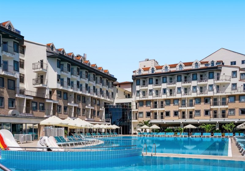 Die Anlage bietet eine Empfangshalle mit Rezeption und Sitzbereichen, Konferenzräume sowie eine Einkaufsarkade mit Kiosk und Friseur. WLAN steht in der gesamten Anlage zur Verfügung. Draußen warten Süßwasser-Swimmingpool, Kinderbecken, Relaxepool und ein separater Pool mit zwei Wasserrutschen.