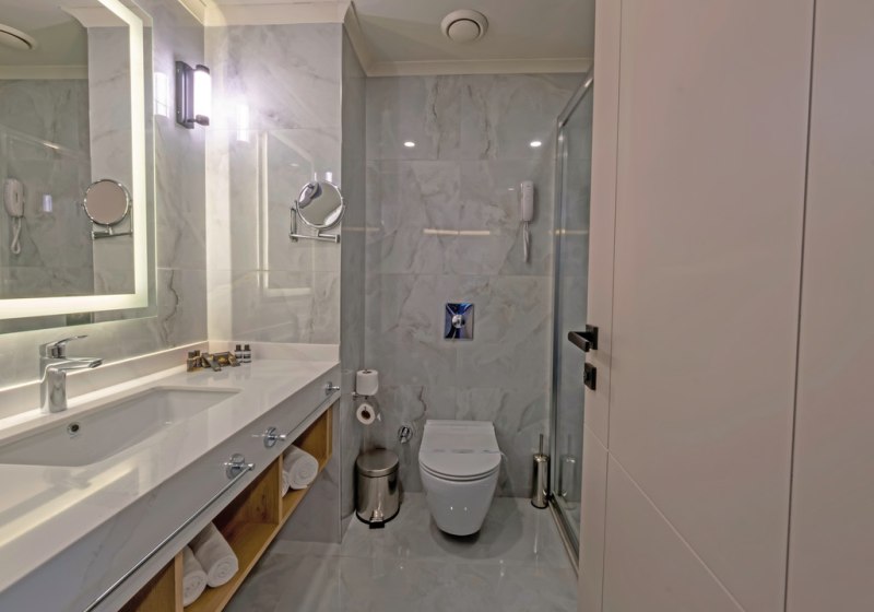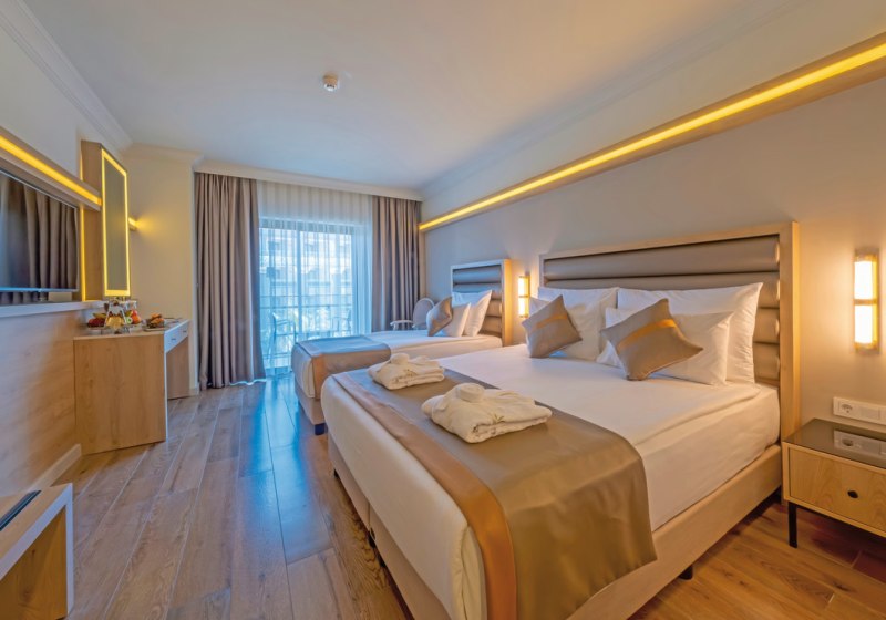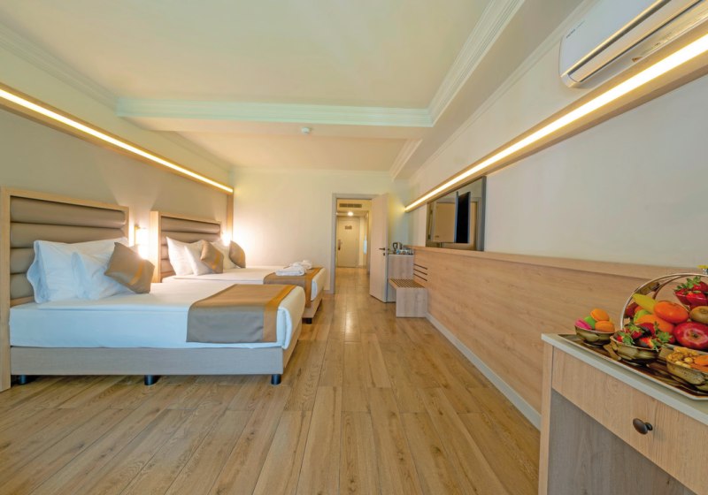 Ihr residiert durch die Strandpromenade vom flach abfallenden Sandstrand getrennt – nah genug für den spontanen Sprung ins Wasser, eigenständig genug für ruhige Stunden im Resort. Der historische Ortskern von Side liegt etwa 10 Kilometer entfernt. Bis zum Flughafen Antalya sind es rund 60 Kilometer. Vor dem Hotel warten öffentliche Minibusse und Taxis, die Euch flexibel zu Ausflügen bringen.