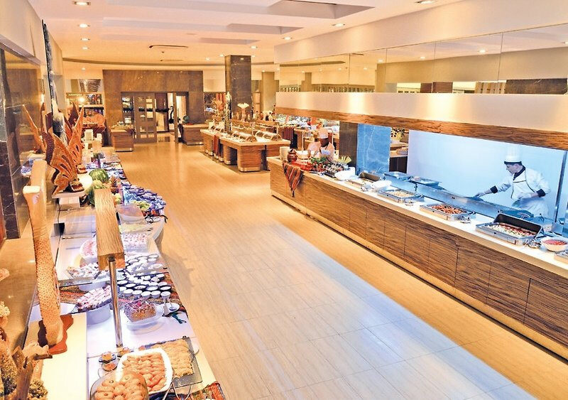 Ein Buffetrestaurant mit Terrasse bildet die Basis, ergänzt durch vier À-la-carte-Restaurants für italienische, türkische, Fisch- und Grillküche. Lobby-, Pool- und Strandbar versorgen ganztägig. Klimatisiertes Restaurant und Kinderhochstühle sorgen für angenehme Rahmenbedingungen ohne formale Hürden.