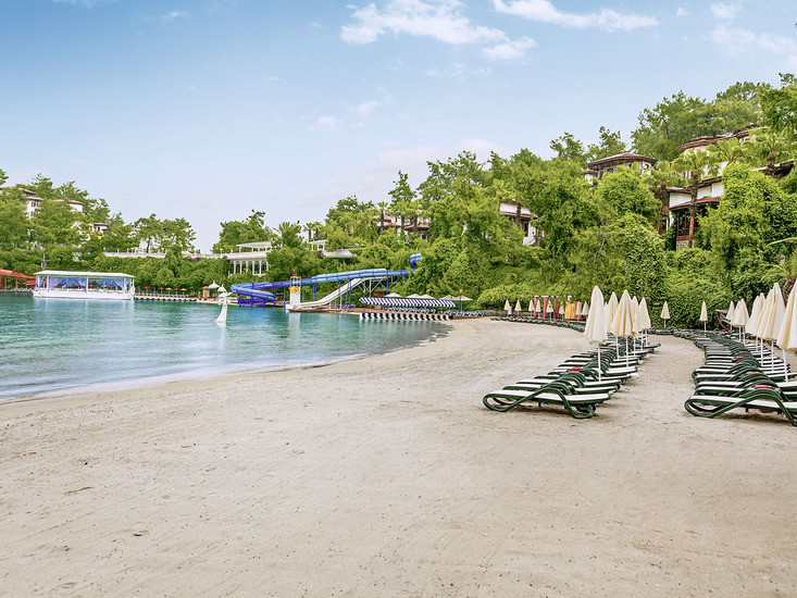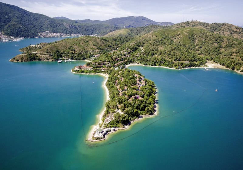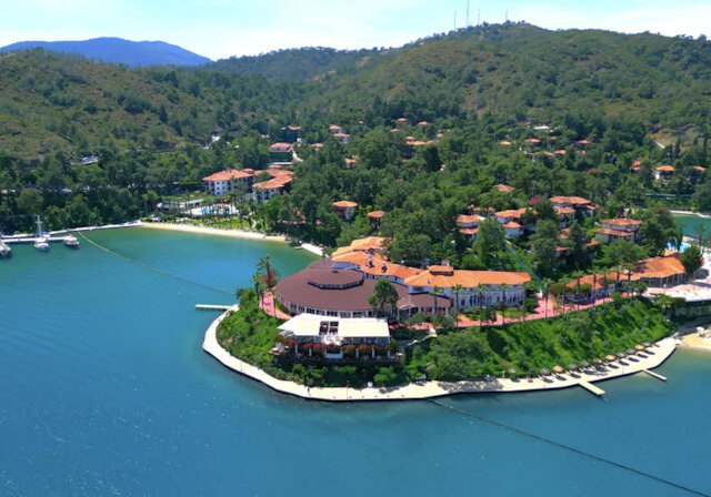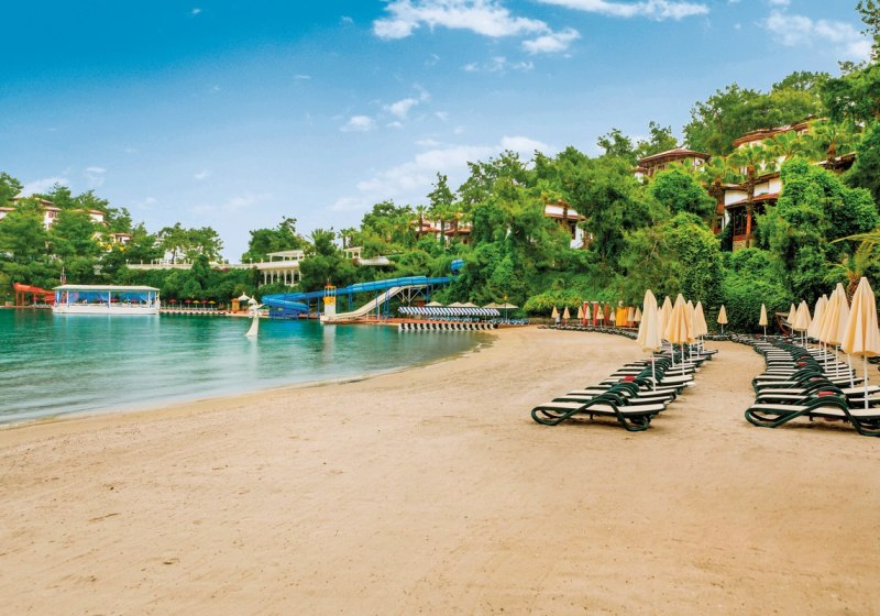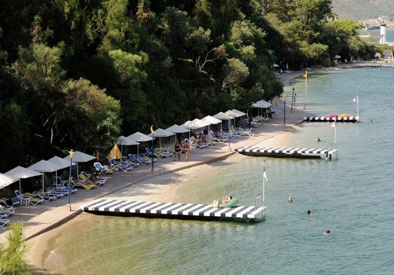 Die Lage auf einer Halbinsel bei Fethiye verbindet Natur und Nähe zur Stadt: Zum Zentrum sind es etwa 4 km, zum Flughafen Dalaman rund 57 km. Der direkte Strandzugang prägt Euren Tag, mit Liegen, Sonnenschirmen, Auflagen und Badetüchern an Strand und Pool. Zwei Strandbars und eine Strandzone mit ausgewiesenen Bereichen machen Pausen unkompliziert. Dank ÖPNV-Haltestelle in etwa 20 m erreicht Ihr das Umland bequem, während das Meer wortwörtlich vor der Tür liegt. Auf der Halbinsel liegen drei hoteleigene Sand-/Kiesstrände – so verteilt Ihr Euch je nach Stimmung auf verschiedene Buchten und genießt vom Morgenbad bis zum Sonnenuntergang kurze Wege und klare Orientierung zwischen Wasser, Gartenwegen und Terrassen.