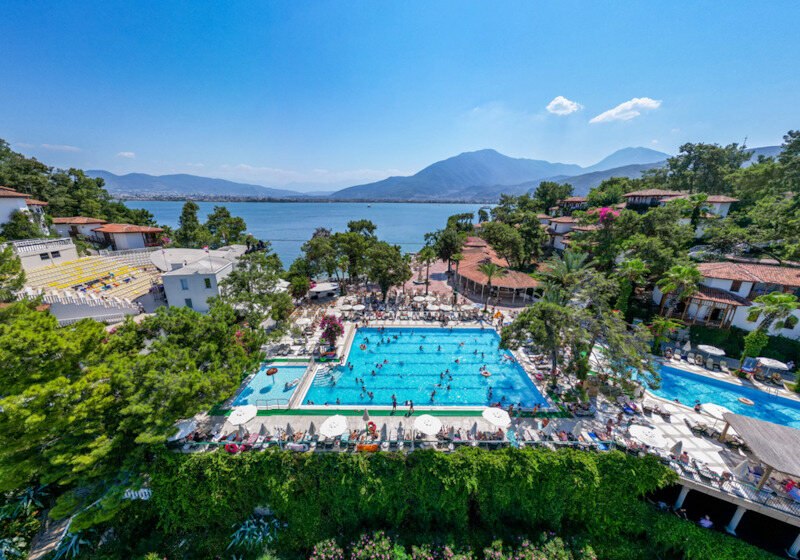Club & Hotel Letoonia empfängt Euch auf einer Halbinsel bei Fethiye mit drei hoteleigenen Sand-/Kiesstränden und drei Süßwasserpools. Zwischen Amphitheater, Gartenbereichen und Terrassen wählt Ihr Tagesrhythmus und Stimmung: aktiv am Wasser, entspannt im Schatten oder gemeinsam bei Shows am Abend. Familien fühlen sich mit Miniclub, Kinderpool und Wasserpark gut aufgehoben, Strandurlauber schätzen die kurzen Wege ins Meer und die Strandbars.